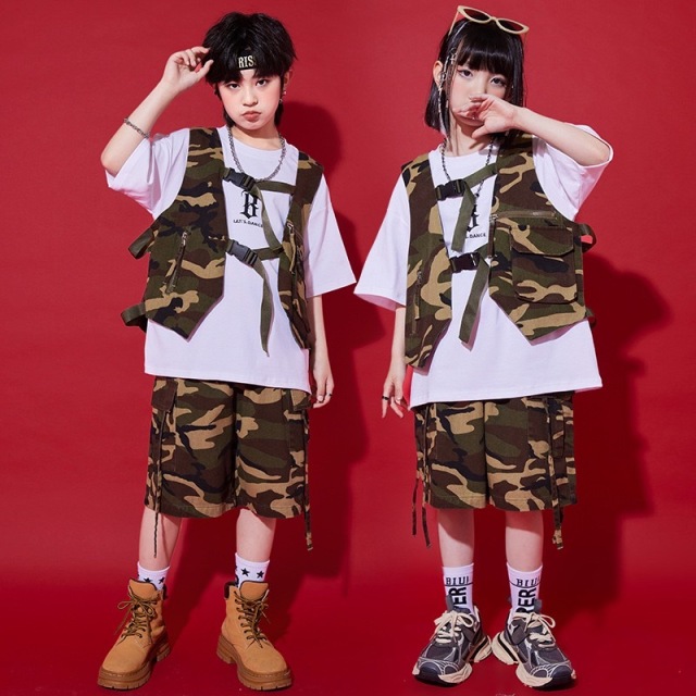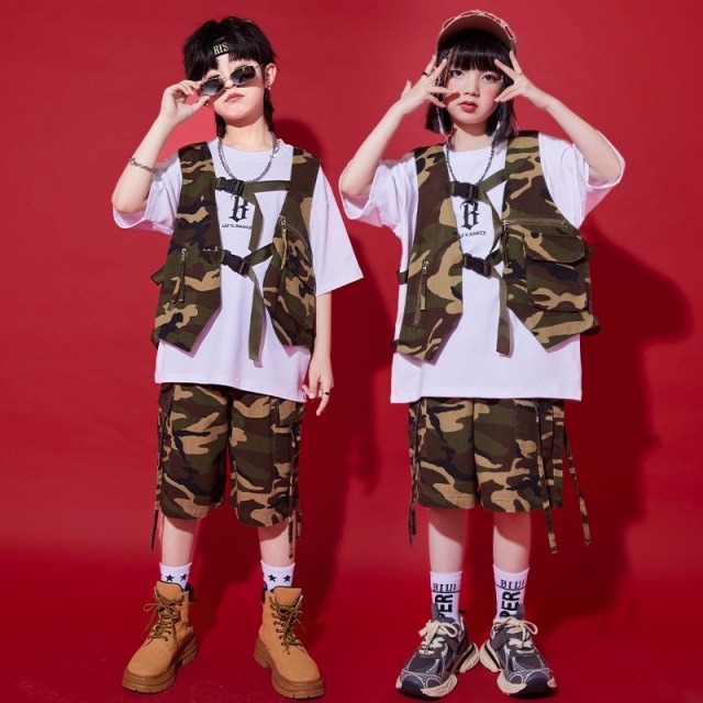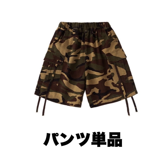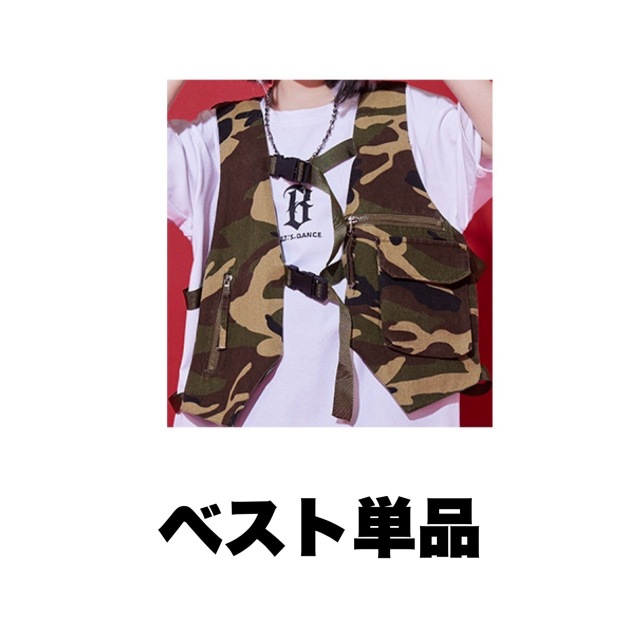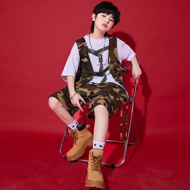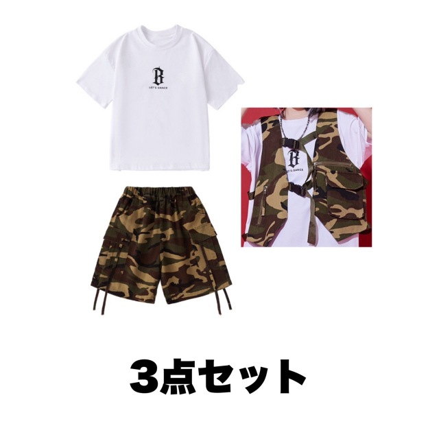 迷彩柄のハーフパンツとベストがかっこいいキッズダンスセットアップです。3点セット、トップス単品、パンツ単品、ベスト単品の4タイプ展開。ミリタリーテイストの迷彩デザインが特徴的で、トレンドのストリートファッションスタイルに最適。ヒップホップダンスの発表会や練習着におすすめです。