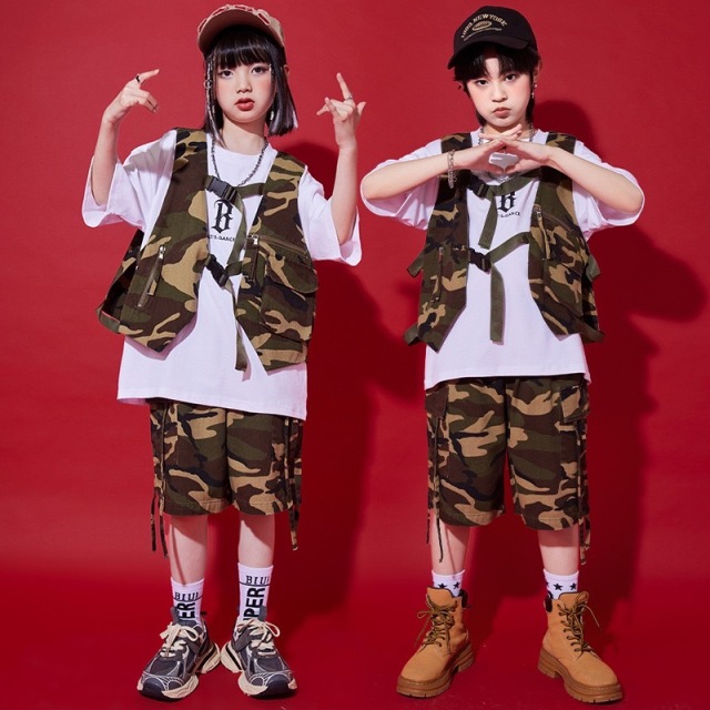 キッズダンス衣装 セットアップ 迷彩ハーフパンツ ベストヒップホップ hiphop kpop 韓国 子供 キッズ ダンス衣装 女の子 男の子