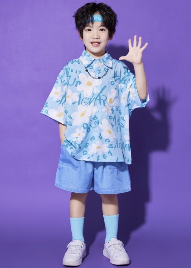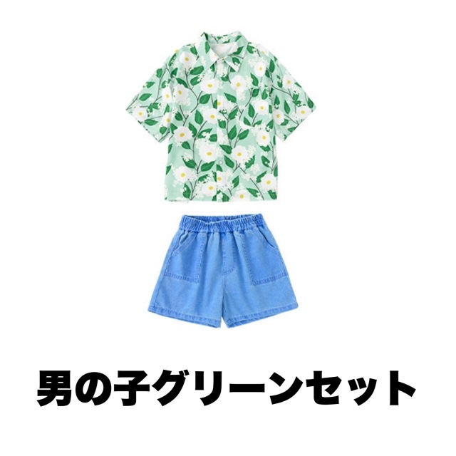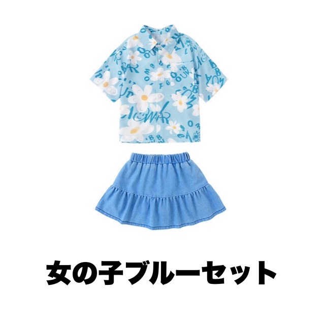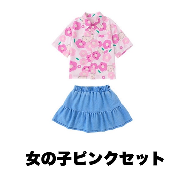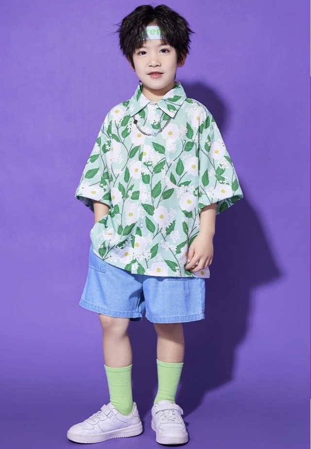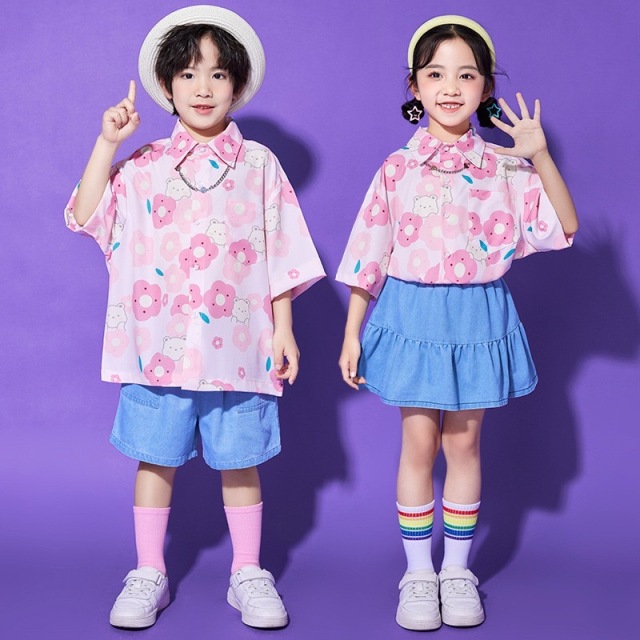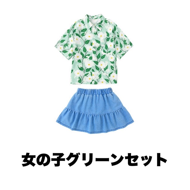 ピンク・ブルー・グリーンの3色から選べるTシャツとボトムスのキッズダンスセットアップです。男の子用セット3種、女の子用セット3種、トップス単品3色、パンツ単品、スカート単品と豊富なバリエーション。カラフルで元気なデザインが特徴的で、ヒップホップダンスや韓国kpopスタイルに最適です。