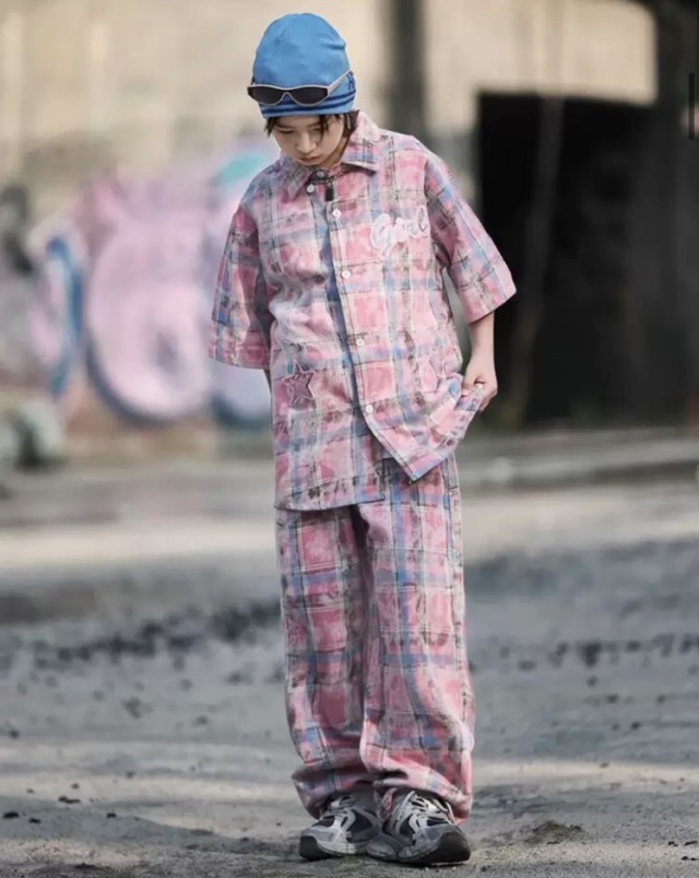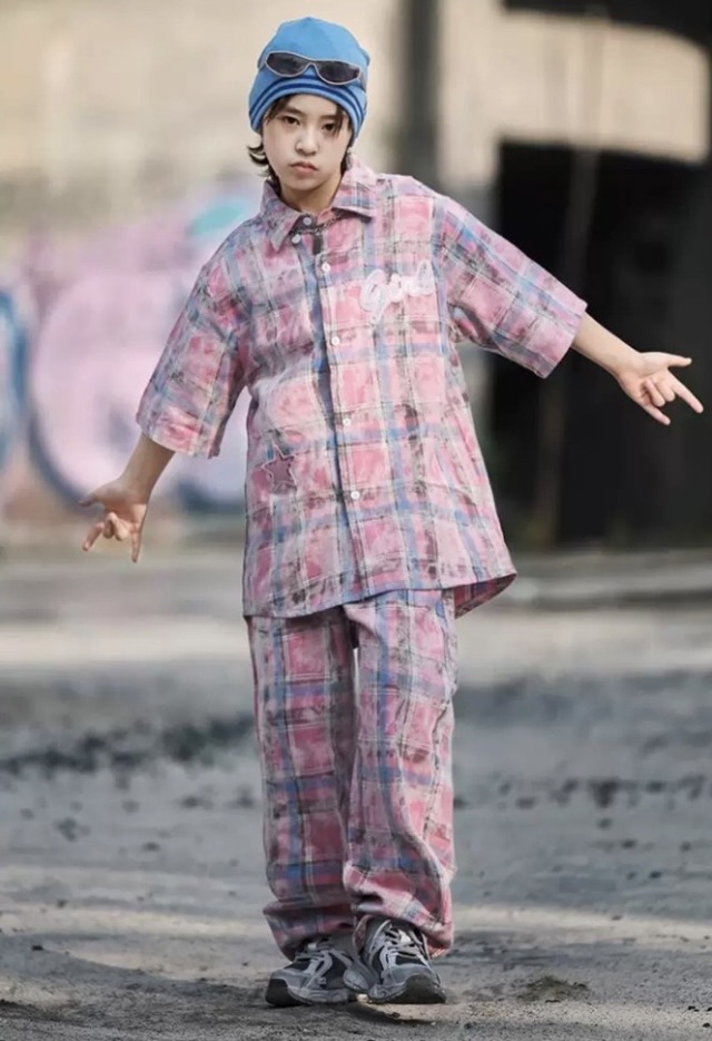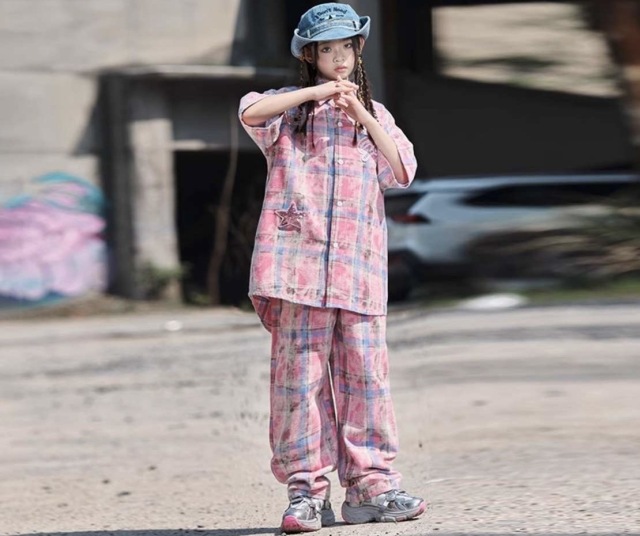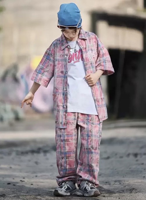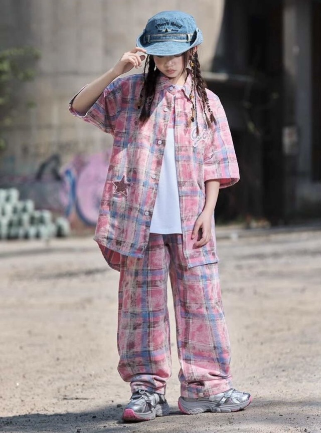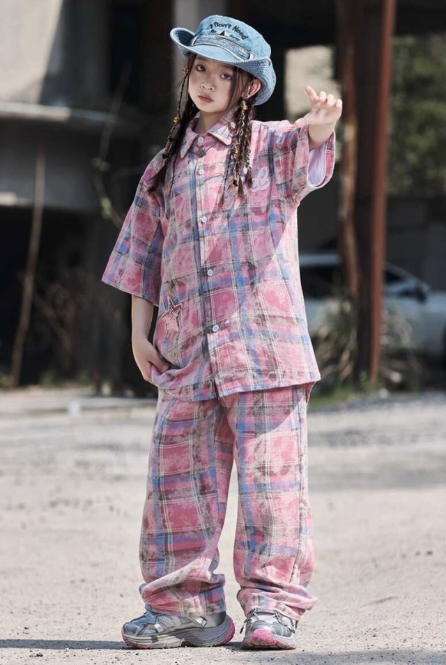 キッズダンス 衣装 シャツ パンツ トップス チェック ピンク パープル ヒップホップ hiphop kpop 韓国 子供 キッズ ダンス衣装 女の子 男の子