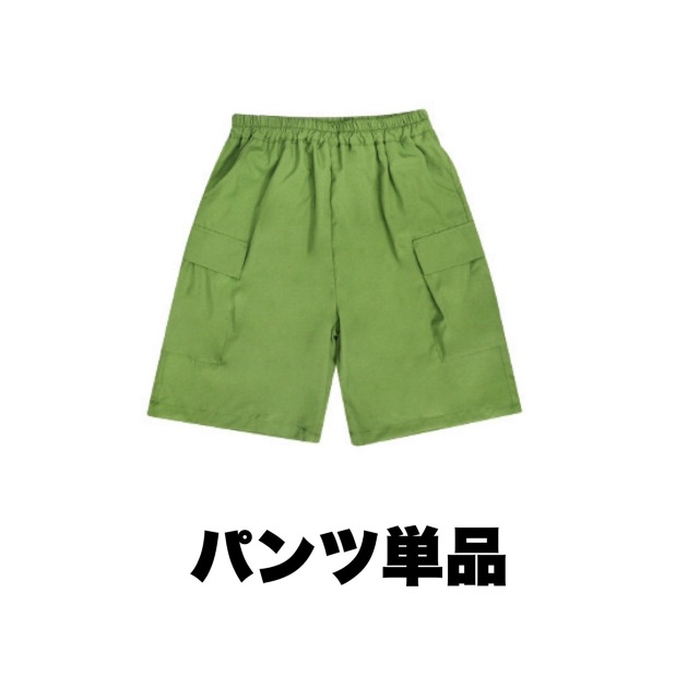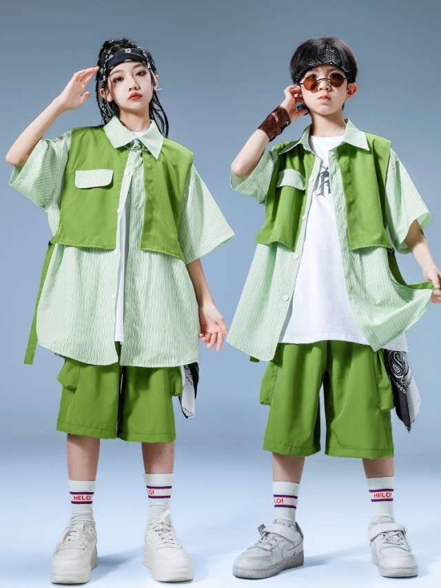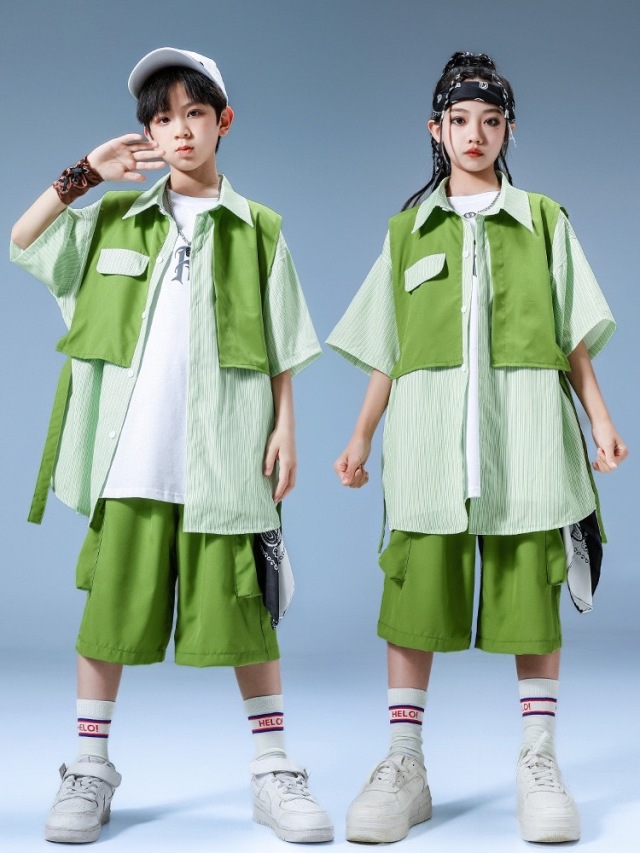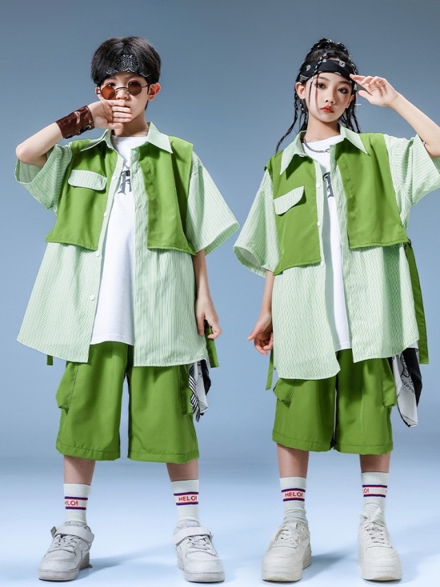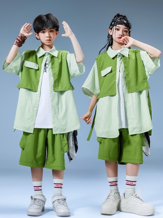 爽やかなグリーン(緑)カラーの半袖シャツとハーフパンツのキッズダンスセットアップです。上下2点セット、トップス単品、パンツ単品の3タイプ展開。明るいグリーンが目を引くデザインで、ヒップホップダンスやスタイリッシュなストリートファッションに最適。女の子にも男の子にも似合う爽やかなスタイルです。