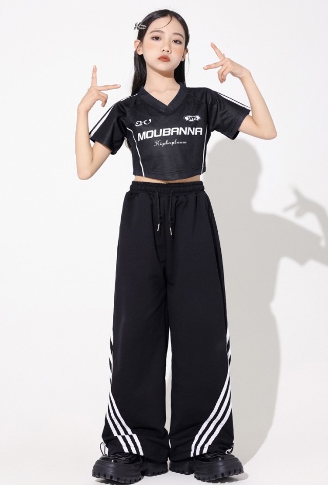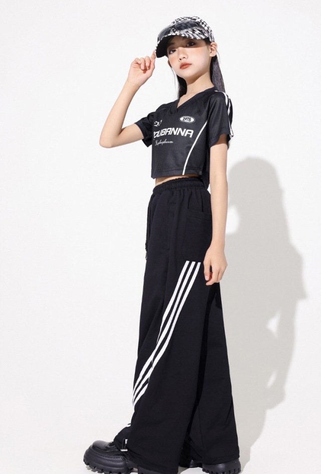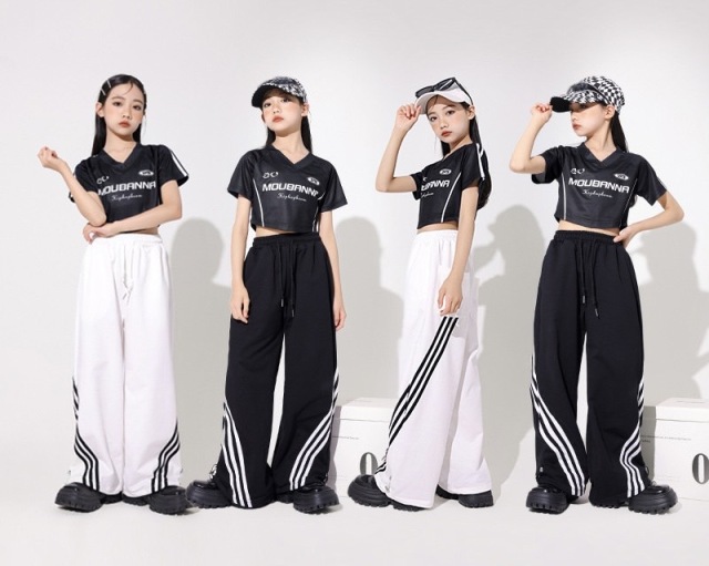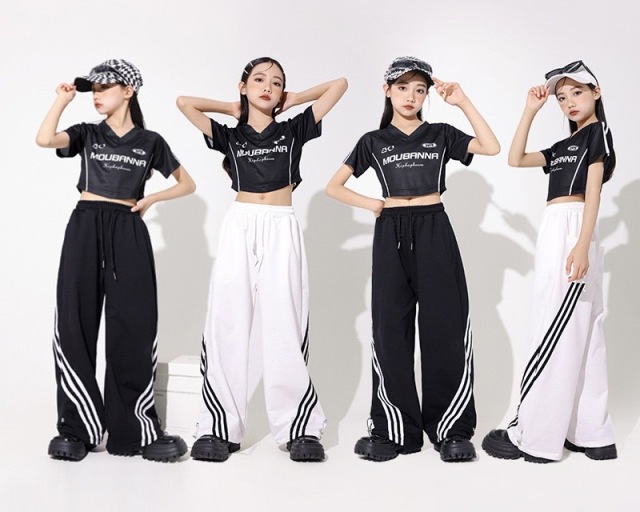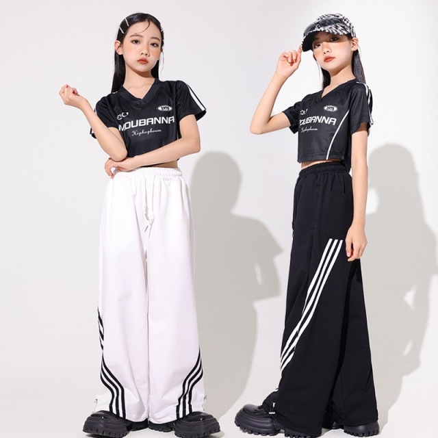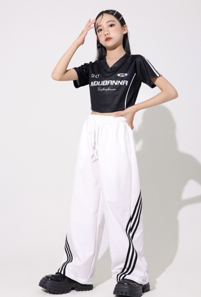 キッズダンス ガールズ 衣装 半袖 シャツ パンツ トップス ヘソ出し ショート丈 白 黒 ホワイト ブラック ヒップホップ hiphop kpop 韓国 子供 キッズ ダンス衣装 女の子