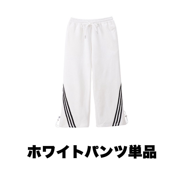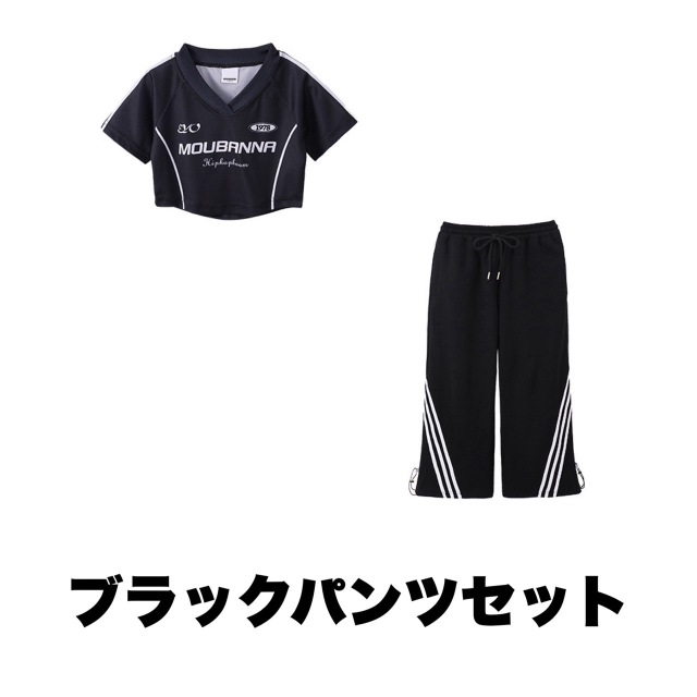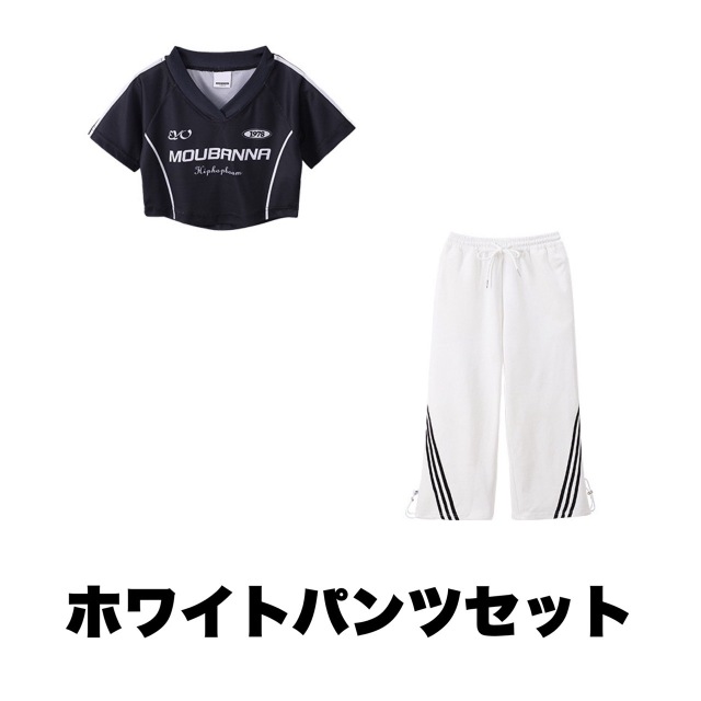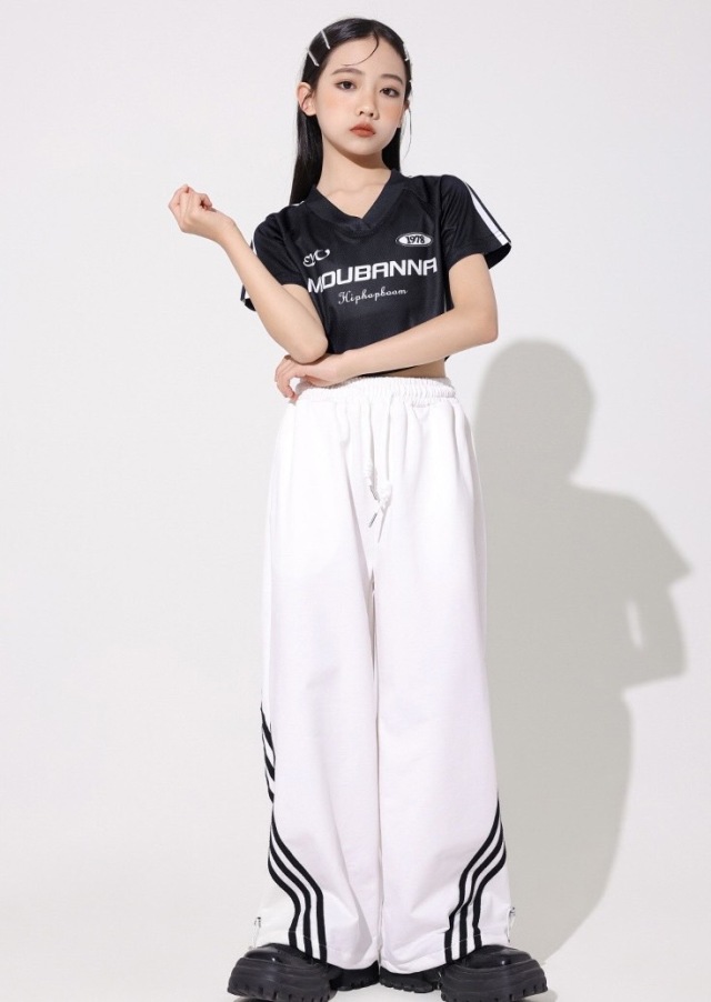 ホワイトとブラックのパンツが選べるガールズ向けセットアップ。半袖のヘソ出しトップスとショート丈デザインで夏のレッスンに最適です。ホワイトパンツセット、ブラックパンツセット、トップス単品、パンツ単品から選べます。110cmから180cmまでの幅広いサイズ展開で、ヒップホップダンスや韓国ストリートファッションとして人気。ダンスレッスンから普段着まで活躍します。