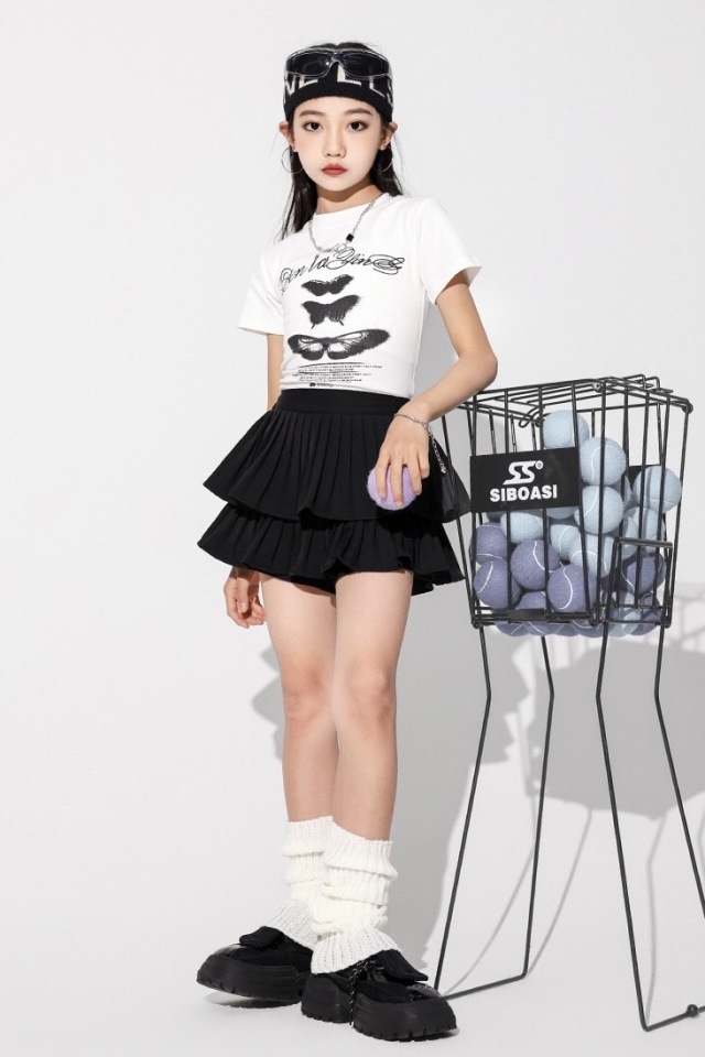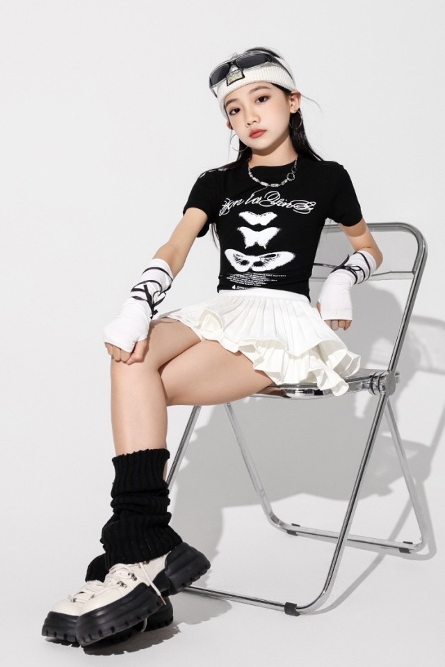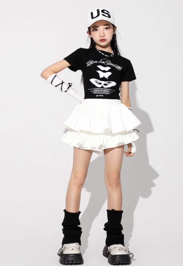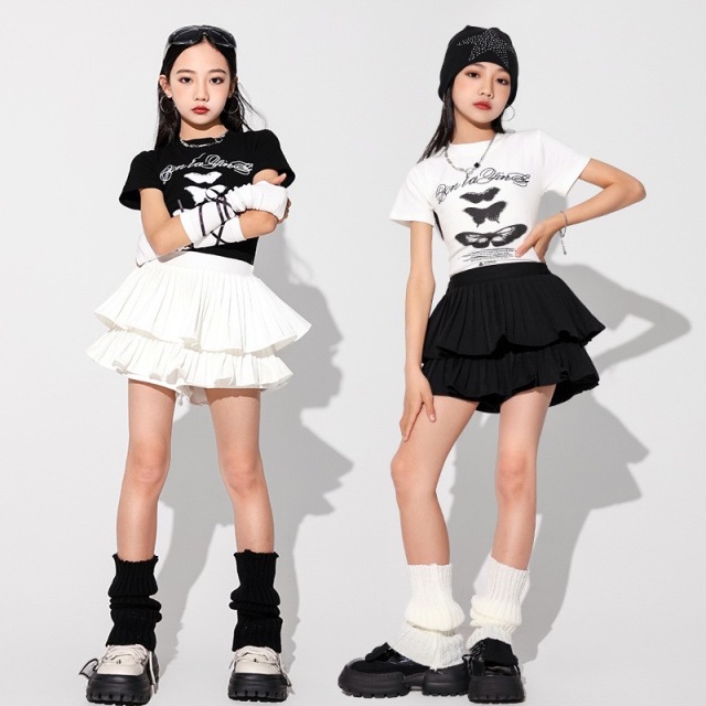キッズ ダンス 衣装 白 黒 スカート tシャツ トップス hiphop kpop 韓国 子供 キッズ ダンス衣装 女の子