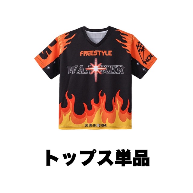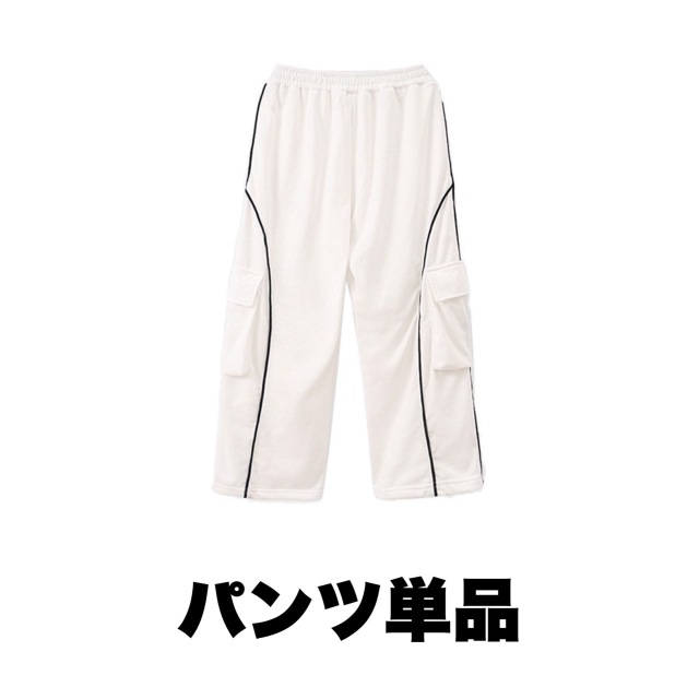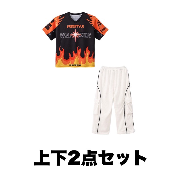 ファイヤーデザインが印象的な半袖Tシャツとホワイトカーゴパンツのキッズダンスセットアップです。上下2点セット、トップス単品、パンツ単品から選択可能。炎のグラフィックが特徴的で、ヒップホップダンスやスタイリッシュなストリートファッションに最適。女の子にも男の子にも似合う迫力あるデザインです。
