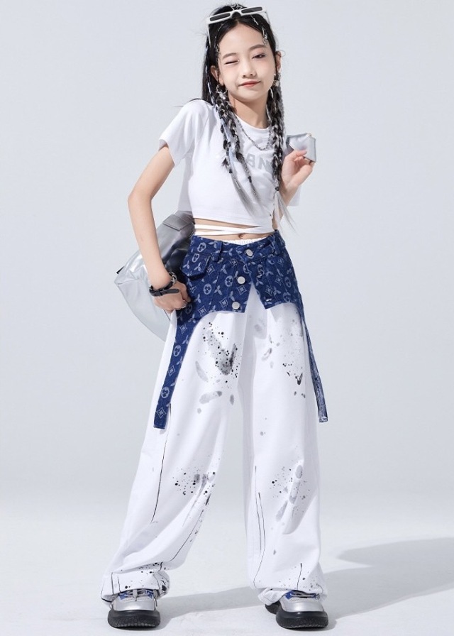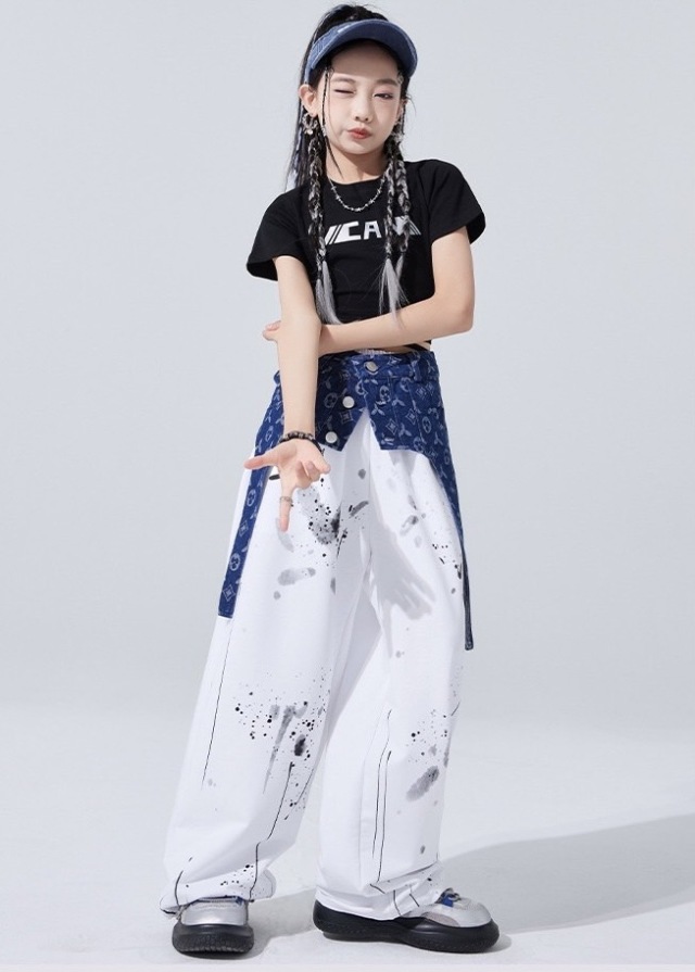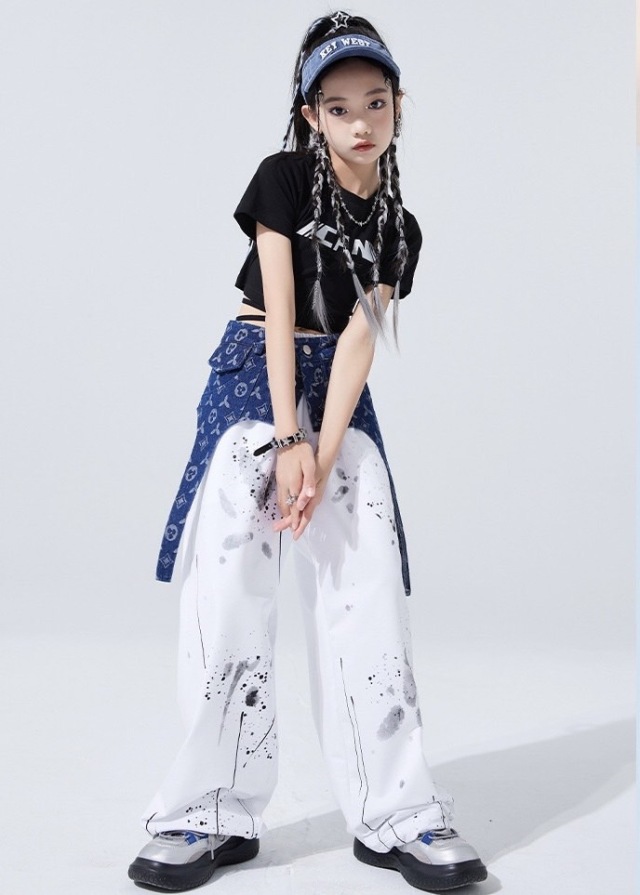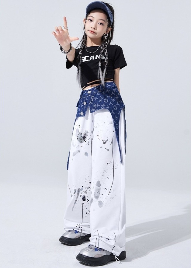 キッズダンス セットアップ 衣装 半袖 シャツ ホワイト パンツ ブラックトップス スウェットパンツ ヒップホップ ガールズ. hiphop kpop 韓国 子供 キッズ ダンス衣装 女の子 男の子