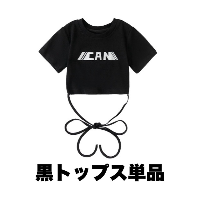 ブラック(黒)とホワイト(白)のトップスとスウェットパンツのキッズダンス衣装です。黒トップス単品、白トップス単品、パンツ単品から選択可能。ヘソ出しのショート丈デザインが特徴的で、ヒップホップダンスやトレンドのストリートファッションに最適。女の子にも男の子にも似合う、身長135cmで140サイズ着用のスタイルです。