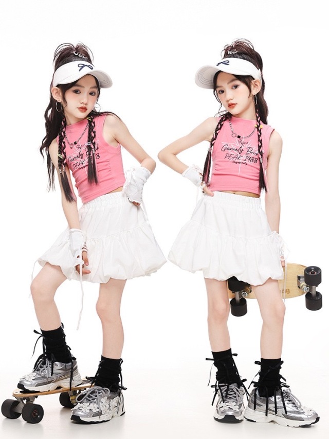 ガールズ キッズダンス セットアップ 衣装 シャツ スカート トップス ピンク ホワイト ヒップホップ ガールズ. hiphop kpop 韓国 子供 キッズ ダンス衣装 女の子 男の子
