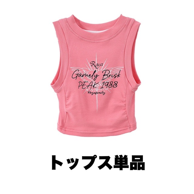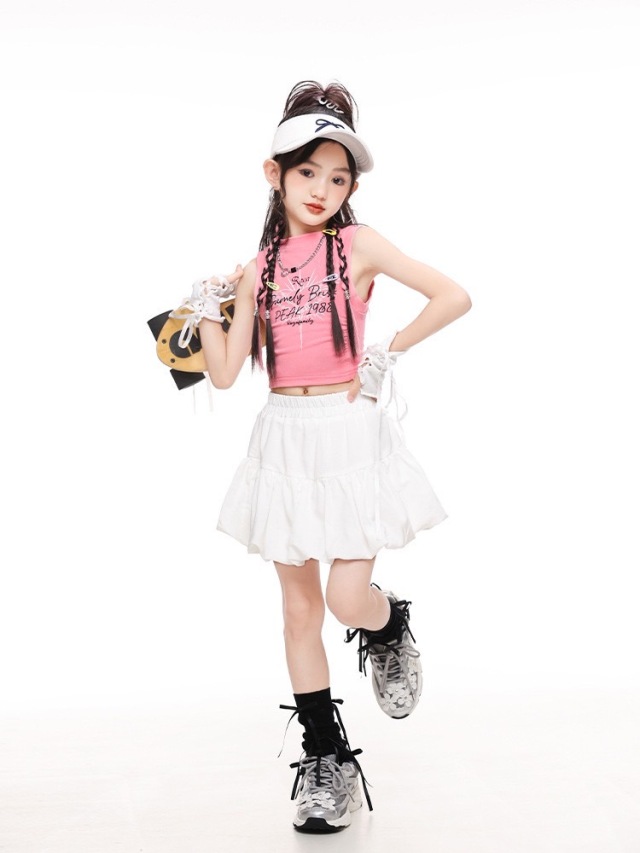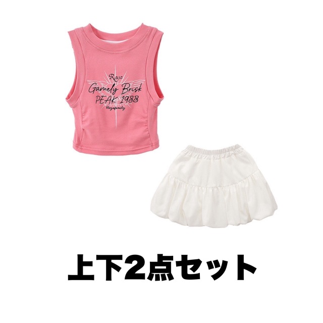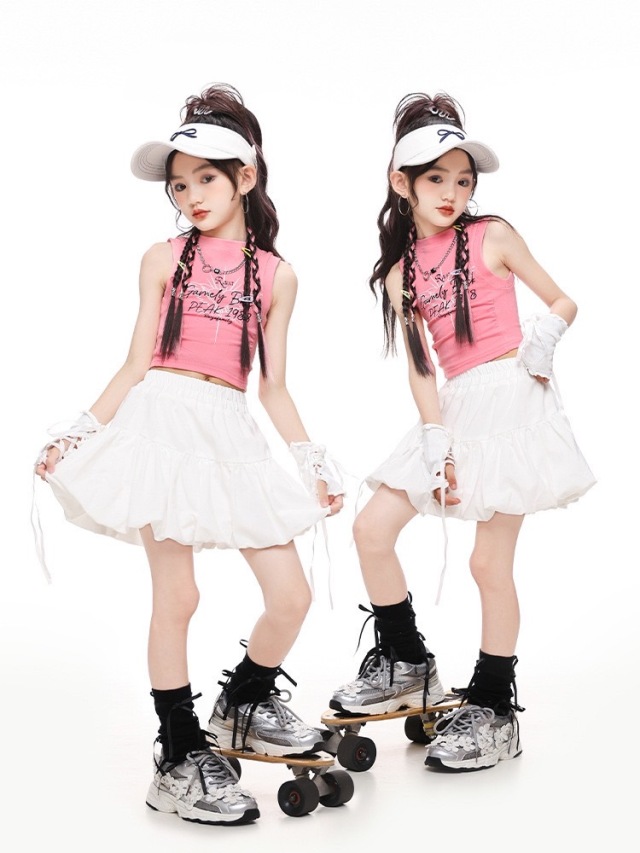 ピンクとホワイト(白)の肩出しタンクトップとスカートのガールズダンス衣装です。上下2点セット、トップス単品、スカート単品から選べます。可愛らしいピンクカラーと肩出しデザインが特徴的で、ヒップホップダンスや流行のストリートファッションに最適。女の子の発表会や練習着として活躍する華やかなアイテムです。