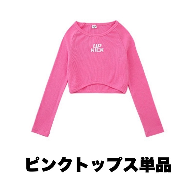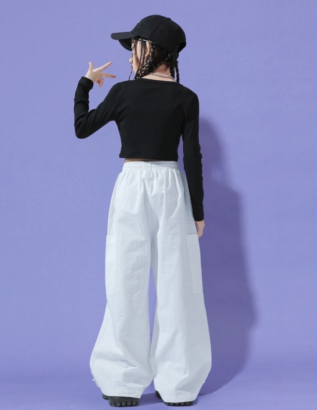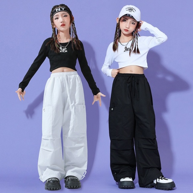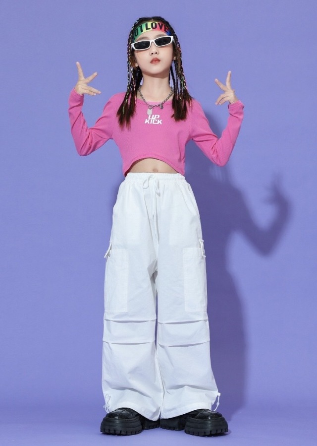 ピンク、レッド(赤)、ブラック(黒)、ホワイト(白)の長袖ヘソ出しシャツとパンツのガールズダンス衣装です。各色トップス単品、黒・白パンツ単品から選べます。サイズは110-180cm展開。ショート丈デザインが特徴的で、ヒップホップダンスやK-POP風ストリートスタイルに最適。カラフルな色展開で発表会やステージ衣装におすすめです。
