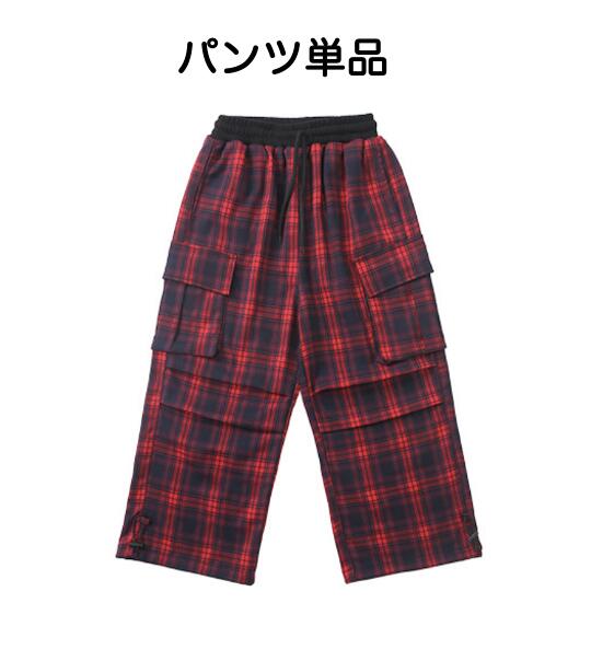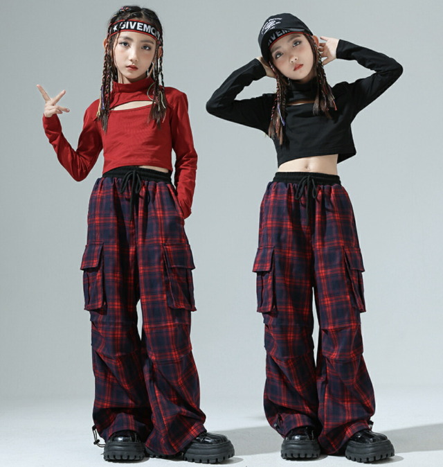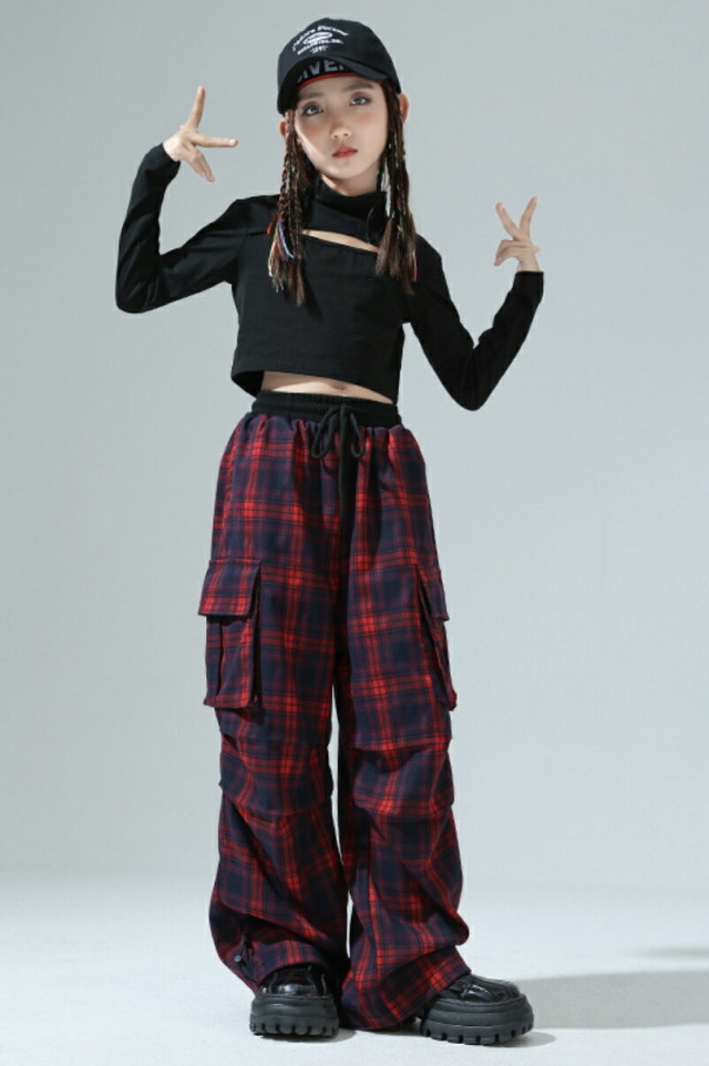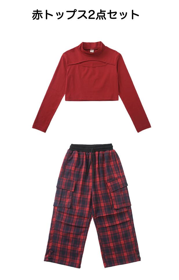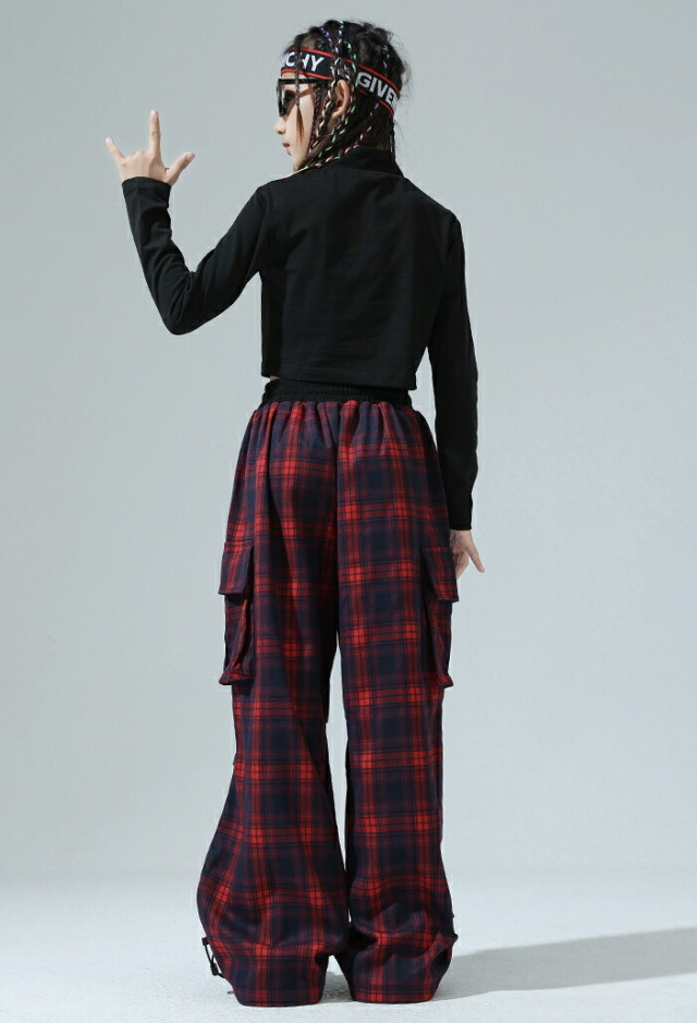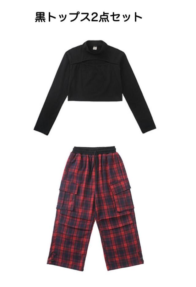 キッズダンス衣装 セットアップ 長袖 シャツ ブラック レッド ショート丈 ヘソだし パンツ チェック 柄 ヒップホップ hiphop kpop 韓国 子供 キッズ ダンス衣装 女の子