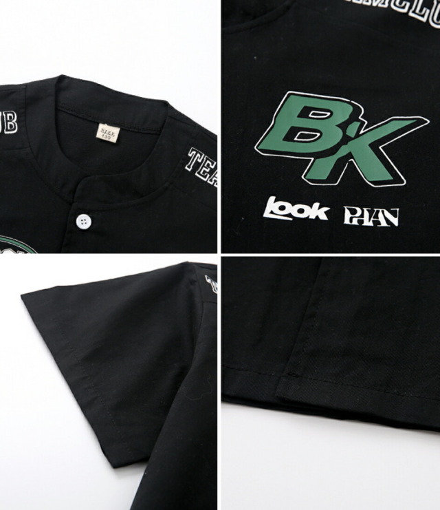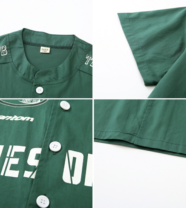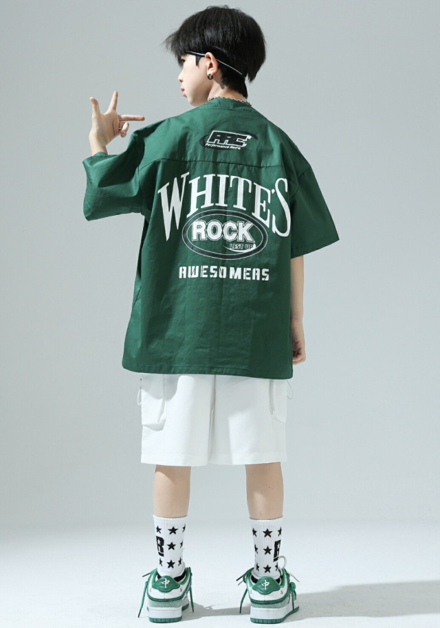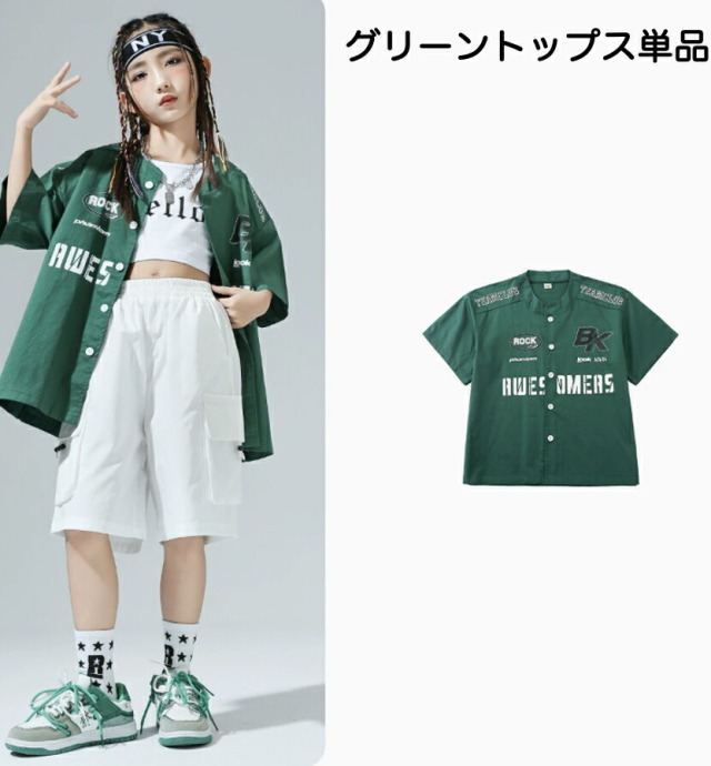 グリーンとブラックの半袖シャツとハーフパンツのセットアップ。短パンで夏のダンスレッスンに最適です。2点セット、トップス単品、パンツ単品から選べる柔軟性が魅力。110cmから180cmまでの豊富なサイズ展開で、男の子も女の子も着用可能。ヒップホップダンスや韓国ストリートファッションとして人気で、かっこいいデザインがレッスンから普段着まで幅広く活躍するアイテムです。
