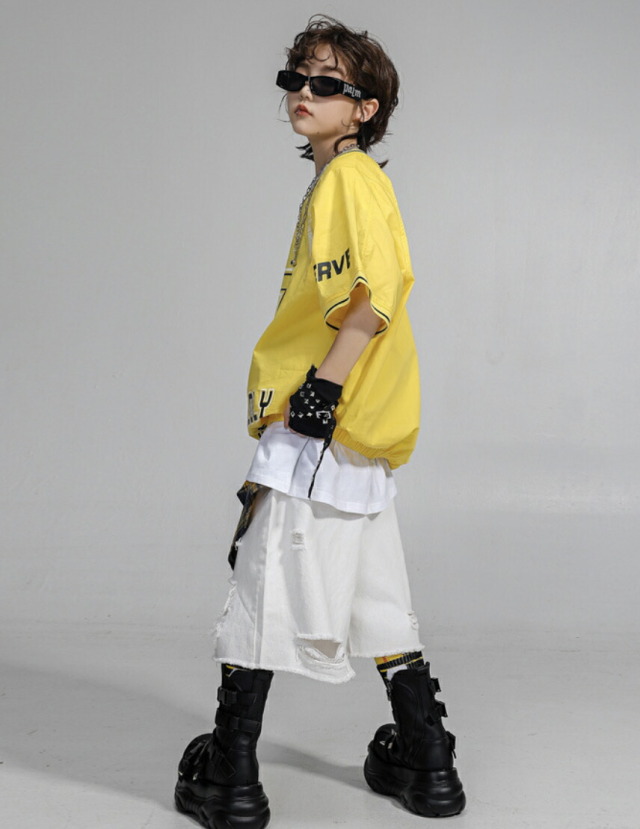 カラフルな半袖シャツとパンツのキッズダンス衣装です。レッド(赤)、グリーン(緑)、イエロー(黄色)のトップス単品、迷彩パンツ単品、ホワイトダメージパンツ単品から選べます。サイズは110-180cm展開。個性的なカラーと迷彩デザインが特徴的で、ヒップホップダンスやスタイリッシュなストリートファッションに最適です。