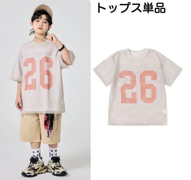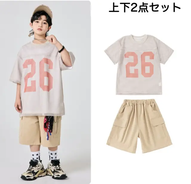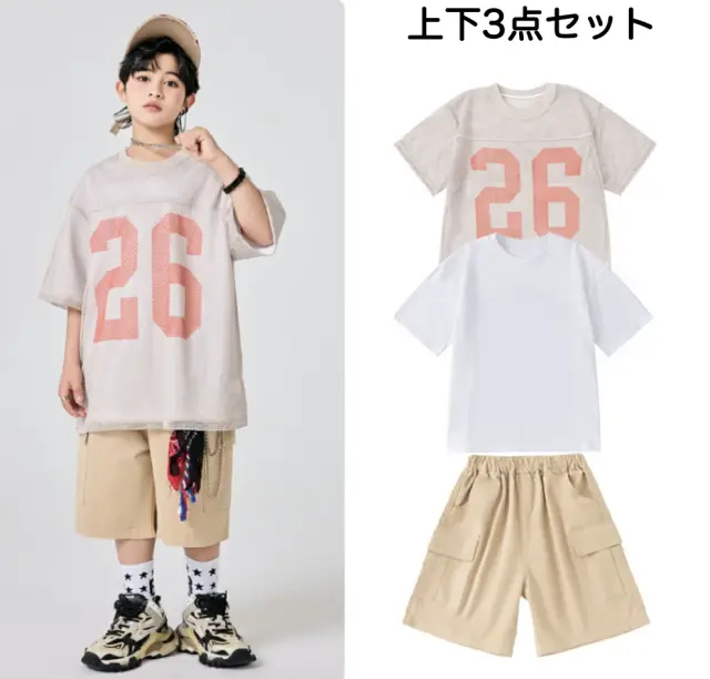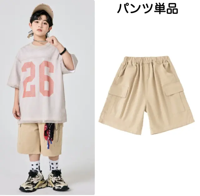 ベージュのアースカラー半袖シャツとハーフパンツのキッズダンスセットアップです。3点セット、2点セット、トップス単品、パンツ単品から選択可能。サイズは110-180cm展開。落ち着いたベージュカラーが特徴的で、ヒップホップダンスや最新トレンドのストリートファッションに最適。女の子にも男の子にも似合うナチュラルなスタイルです。