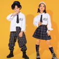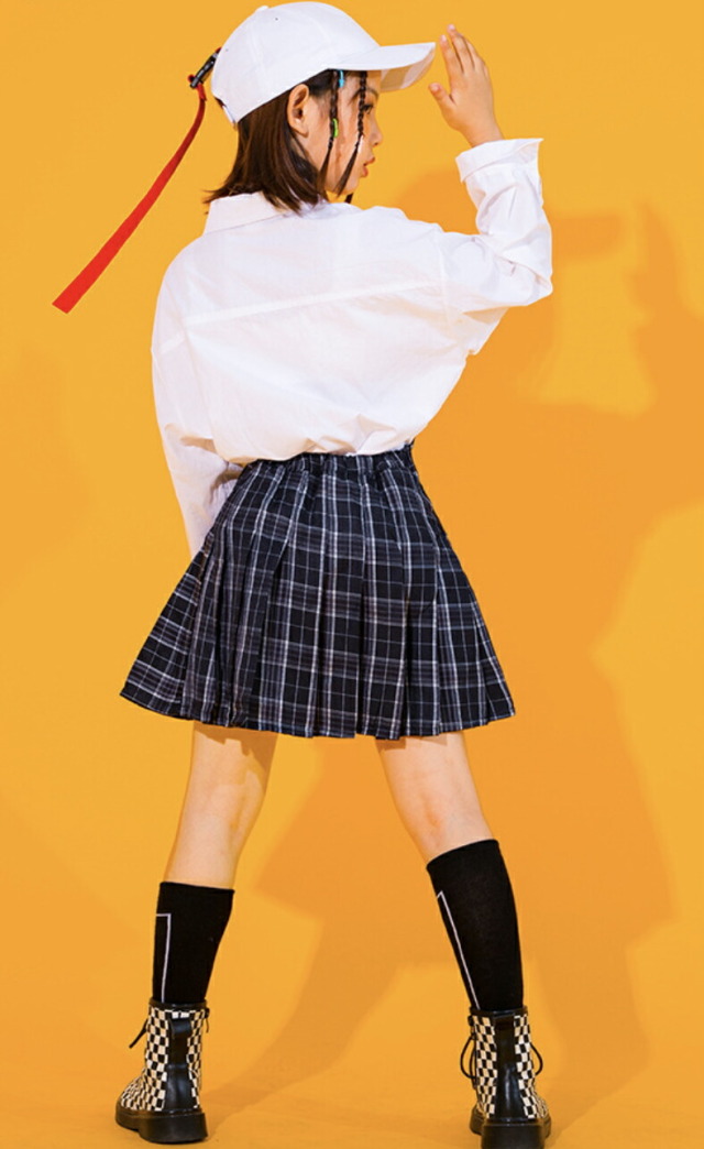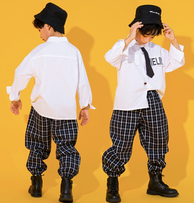 チェック柄の制服風ダンス衣装セットです。男の子3点セット(トップス・パンツ・ネクタイ)、女の子3点セット(トップス・スカート・ネクタイ)から選べます。サイズは110-180cm展開。制服スタイルのユニフォームデザインが特徴的で、ヒップホップダンスや韓国kpopスタイルの発表会衣装に最適。女の子にも男の子にも対応できます。