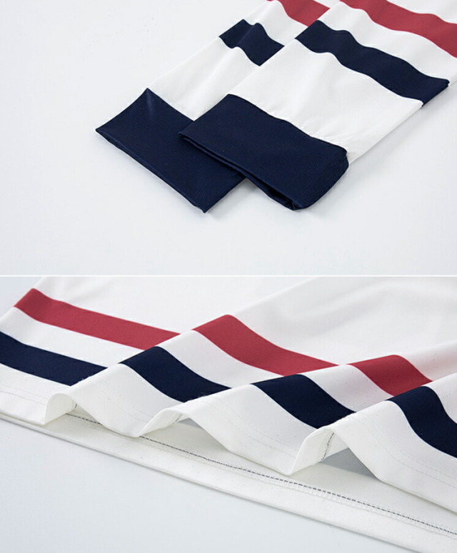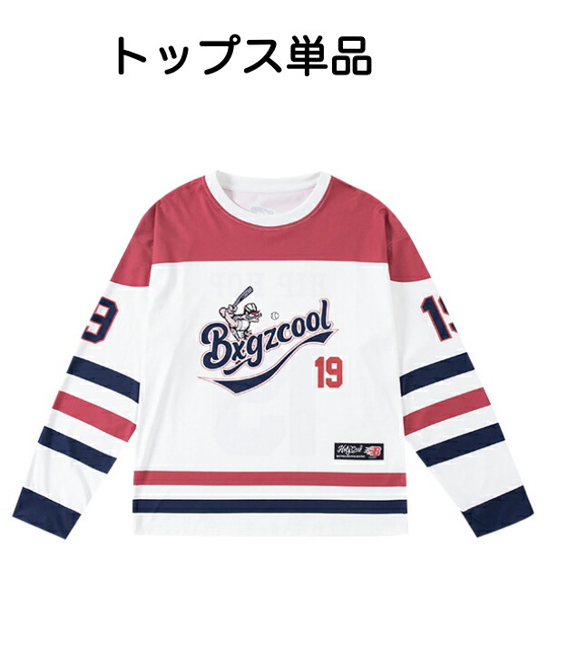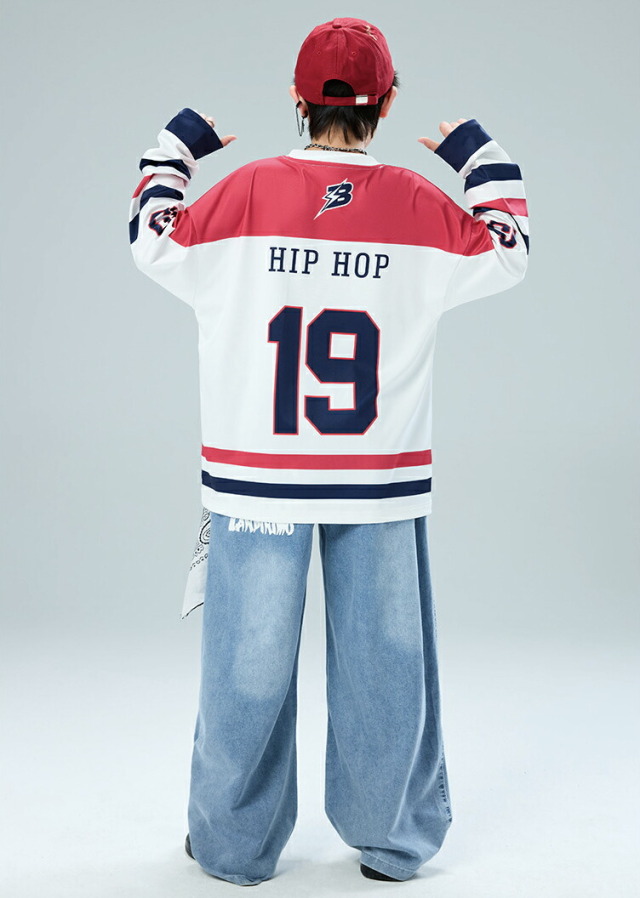 ホワイト(白)とレッド(赤)の長袖デニムシャツとパラシュートパンツのキッズダンスセットアップです。上下2点セット、トップス単品、パンツ単品から選択可能。サイズは110-180cm展開。デニムシャツとゆったりパンツの組み合わせが特徴的で、ヒップホップダンスや都会的なストリートスタイルに最適。女の子にも男の子にも対応できます。