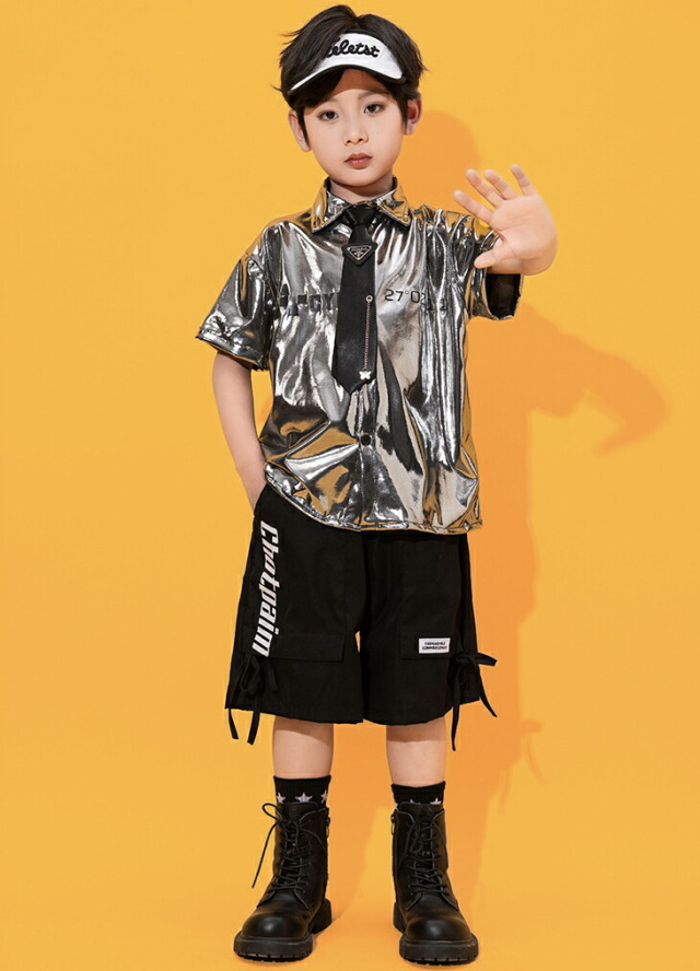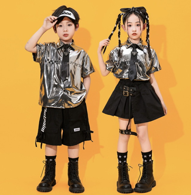シルバー(銀)のネクタイが付いた制服風ダンス衣装セットです。男の子セット(トップス・ハーフパンツ・ネクタイ)、女の子セット(トップス・スカート・ネクタイ)から選べます。サイズは110-180cm展開。ブラックとシルバーの組み合わせが特徴的で、ヒップホップダンスやK-POP風スタイルの発表会衣装に最適です。