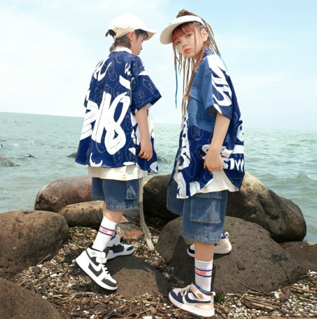 デニム素材の半袖シャツとハーフパンツのセットアップ。ブルーのデニムとロゴデザインがかっこいいストリートスタイルを演出します。2点セット、トップス単品、パンツ単品から選べる柔軟性が魅力。短パンで夏のダンスレッスンに最適です。110cmから180cmまでの豊富なサイズ展開で、男女兼用デザイン。ヒップホップダンスや韓国ストリートファッションとして人気で、レッスンから普段着まで活躍します。
