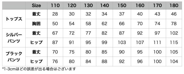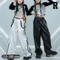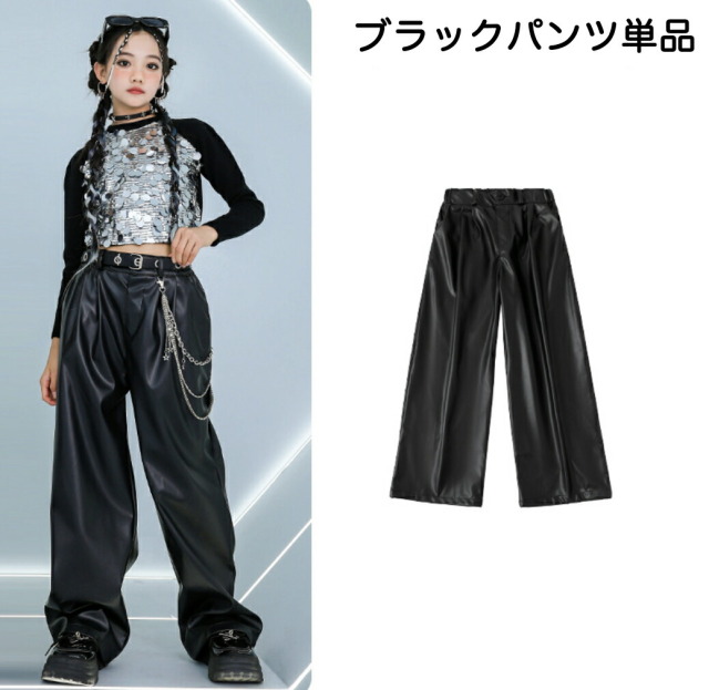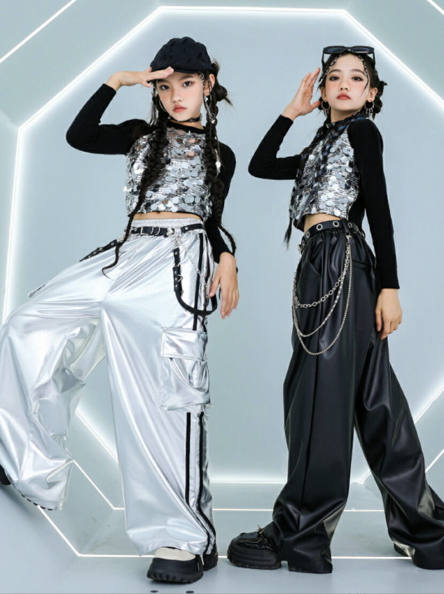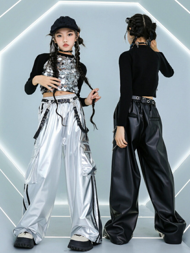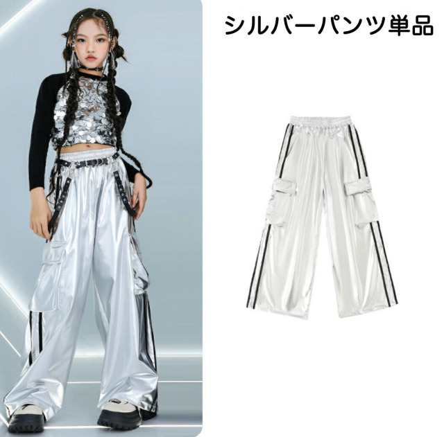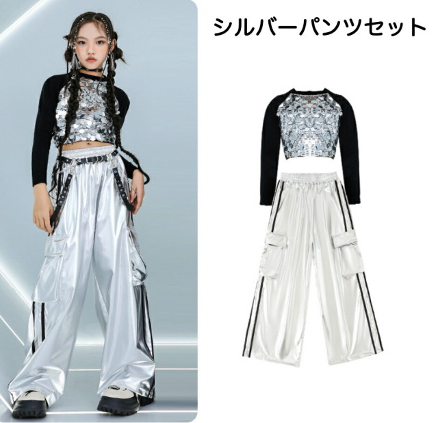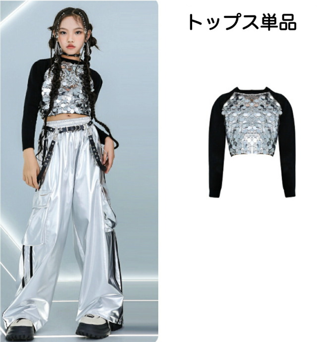 長袖ヘソ出しトップスとパンツのキッズダンス衣装です。シルバーパンツセット、ブラックパンツセット、トップス単品、各パンツ単品から選べます。サイズは110-180cm展開。クロップド丈とメタリックカラーが特徴的で、ヒップホップダンスや韓国kpopストリートスタイルに最適。女の子にも男の子にも似合うステージ映えするアイテムです。