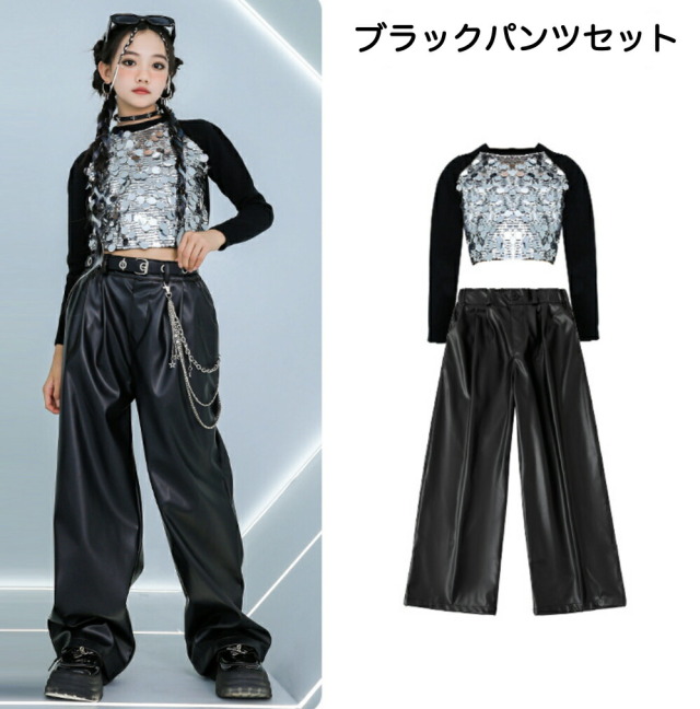 キッズダンス衣装 セットアップ 長袖 トップス ヘソ出し パンツ シルバー ブラック ヒップホップ hiphop kpop 韓国 子供 キッズ ダンス衣装 女の子 男の子