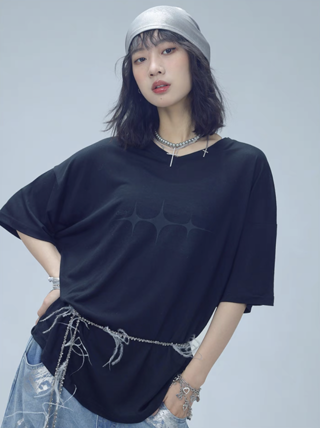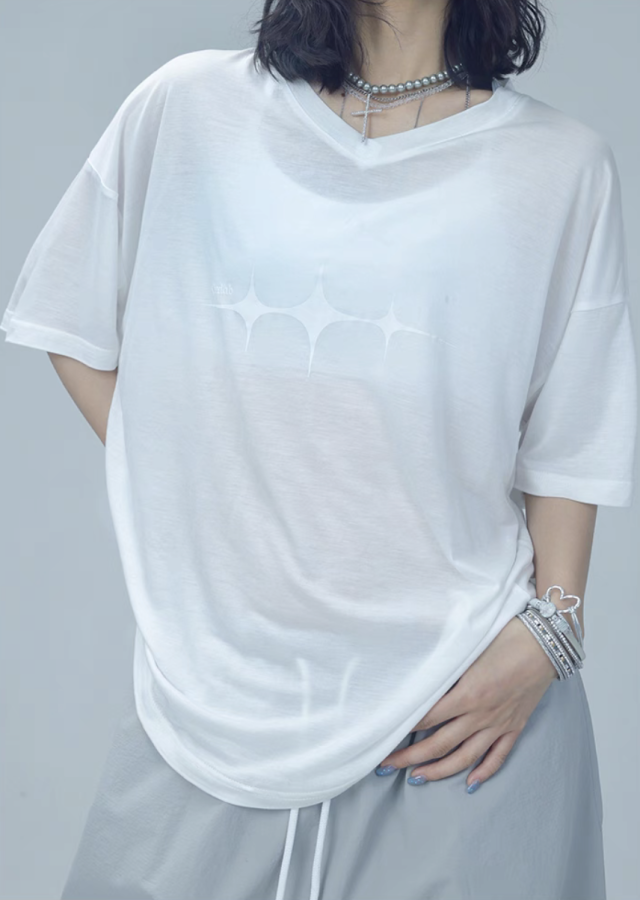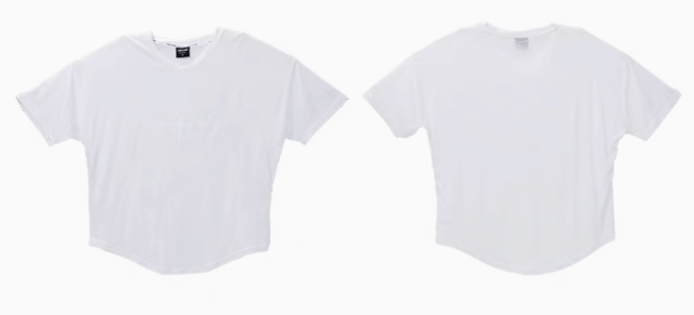 【CBX LAB】の薄手半袖Tシャツです。ホワイト(白)、ブラック(黒)、ライトパープル(薄紫)の3色展開。冷感素材で夏に快適に着用できます。ダボっとしたシルエットが特徴的で、ヒップホップダンスの練習着やレッスン着として最適。身長168cmでLサイズ着用。レディース・ガールズ向けの定番ダンストップスです。