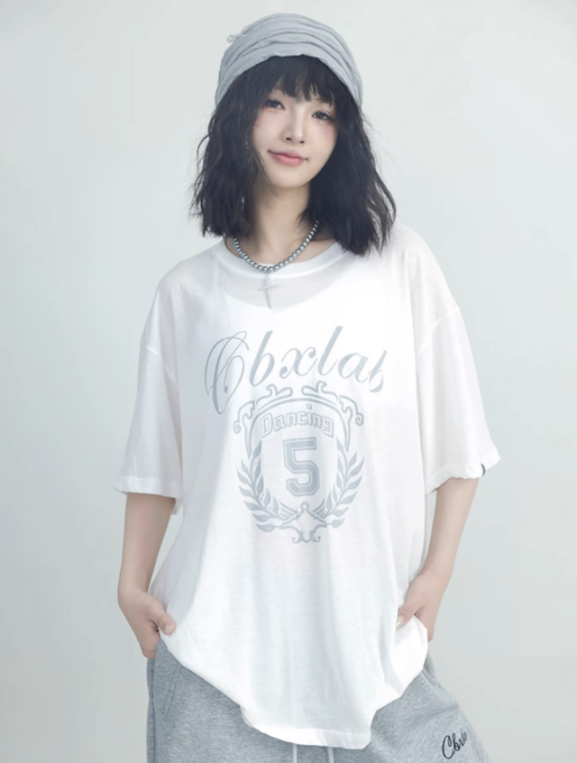 【CBX LAB】の薄手半袖Tシャツです。ホワイト(白)とグレー(灰色)の2色展開。軽量で動きやすい素材が特徴的で、ヒップホップダンスの練習着やレッスン着として最適。身長168cmでLサイズ着用。レディース・ガールズ向けの定番ダンストップスで、夏のダンスシーンや普段使いにもおすすめです。