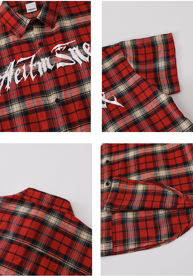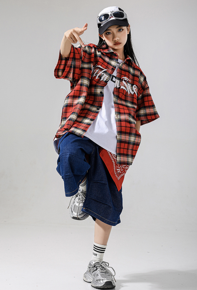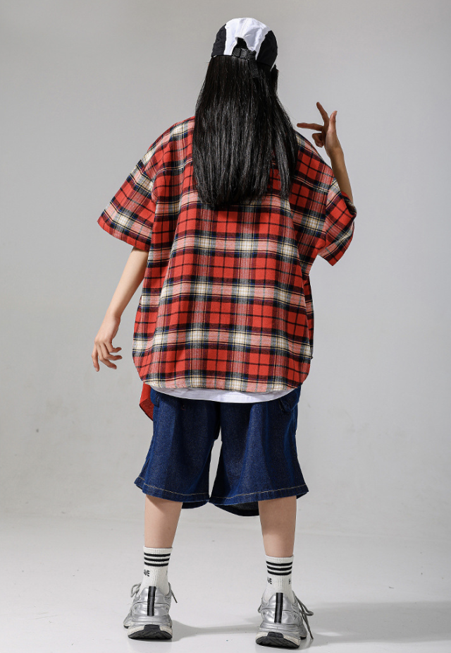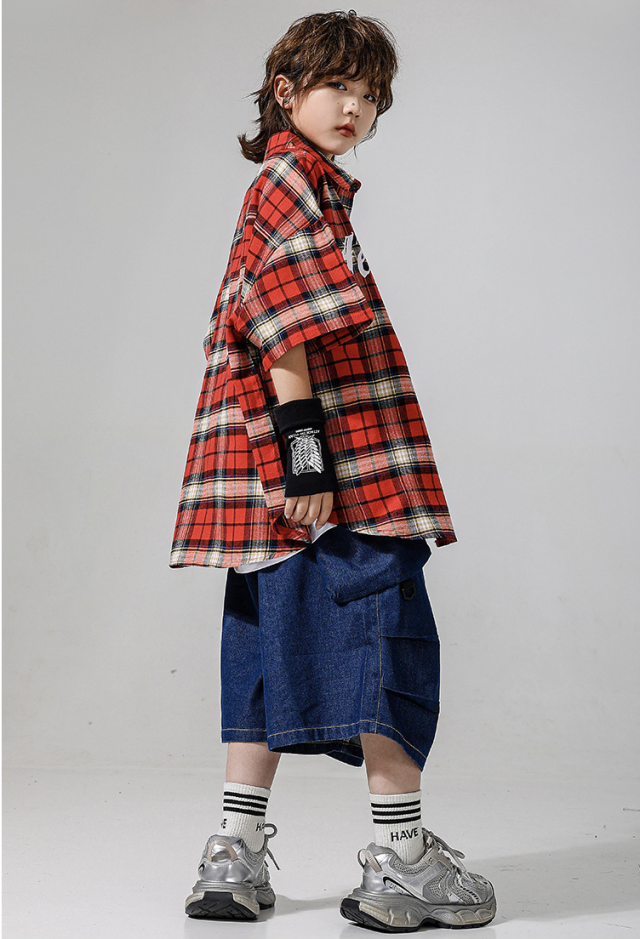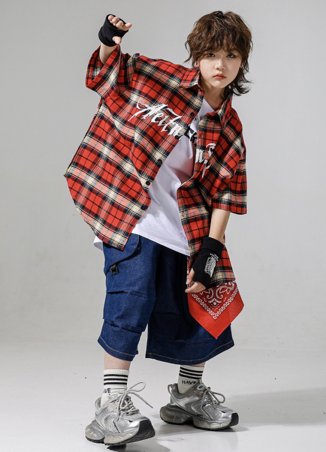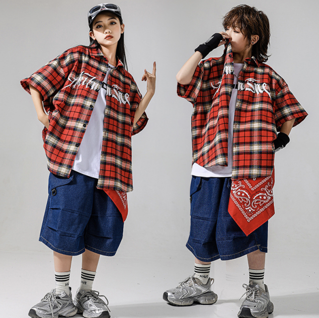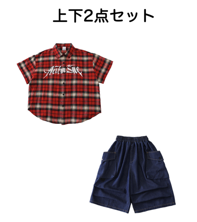 レッドのチェック柄が目を引く半袖シャツとハーフパンツのセットアップ。赤いチェック柄がかっこいいストリートスタイルを演出します。2点セット、トップス単品、パンツ単品から選べる柔軟性が魅力。短パンで夏のレッスンに最適です。110cmから180cmまでの豊富なサイズ展開で、男女兼用デザイン。ヒップホップダンスや韓国ストリートファッションとして人気で、レッスンから普段着まで活躍します。