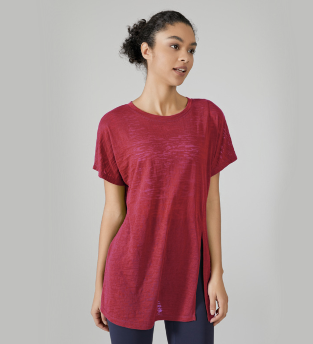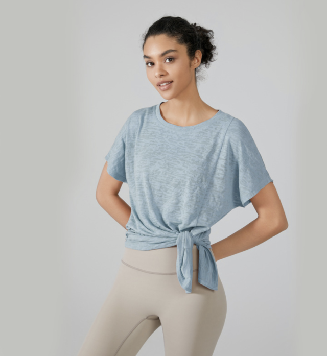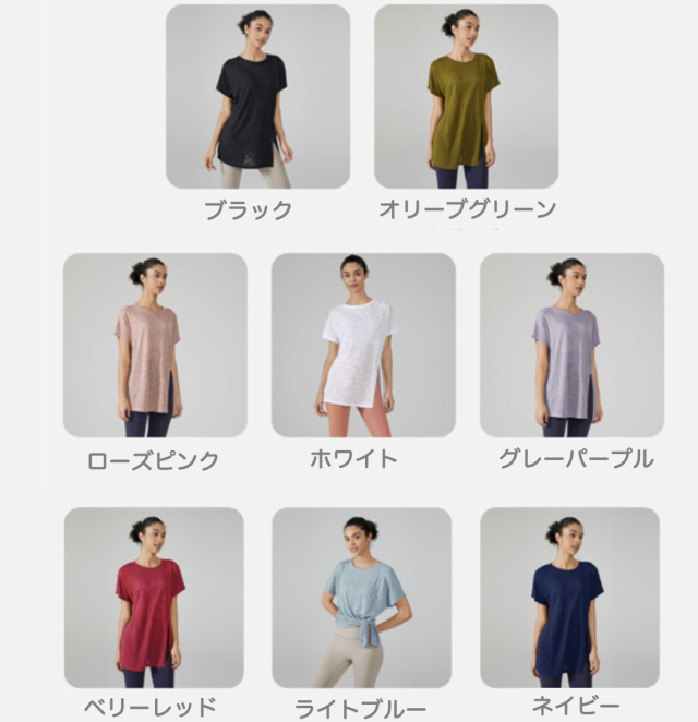 ヘソ出しクロップド丈の半袖トップスです。ピンク、レッド(赤)、ホワイト(白)、ブラック(黒)、パープル(紫)、グリーン(緑)など豊富なカラー展開。サイズはS/MとL/XL。ショート丈デザインが特徴的で、ヨガ、フィットネス、ピラティス、エアロビクス、ホットヨガに最適。ストレッチ性と速乾性に優れたレディース向けトップスです。