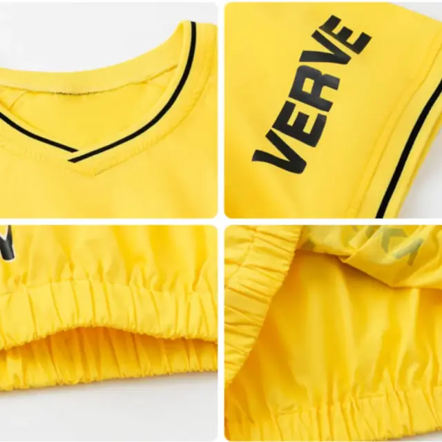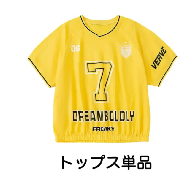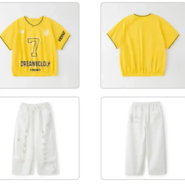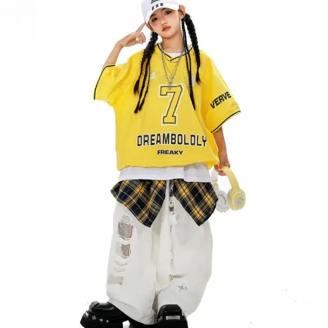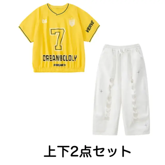 イエローの半袖シャツとホワイトのダメージデニムパンツのセットアップ。ダメージ加工のジーンズがかっこいいストリートスタイルを演出します。セットアップ、トップス単品、パンツ単品から選べる柔軟性が魅力。110cmから180cmまでの豊富なサイズ展開で、ガールズ向けデザイン。ヒップホップダンスや韓国ストリートファッションとして人気で、可愛くてかっこいいデザインがレッスンから普段着まで活躍します。