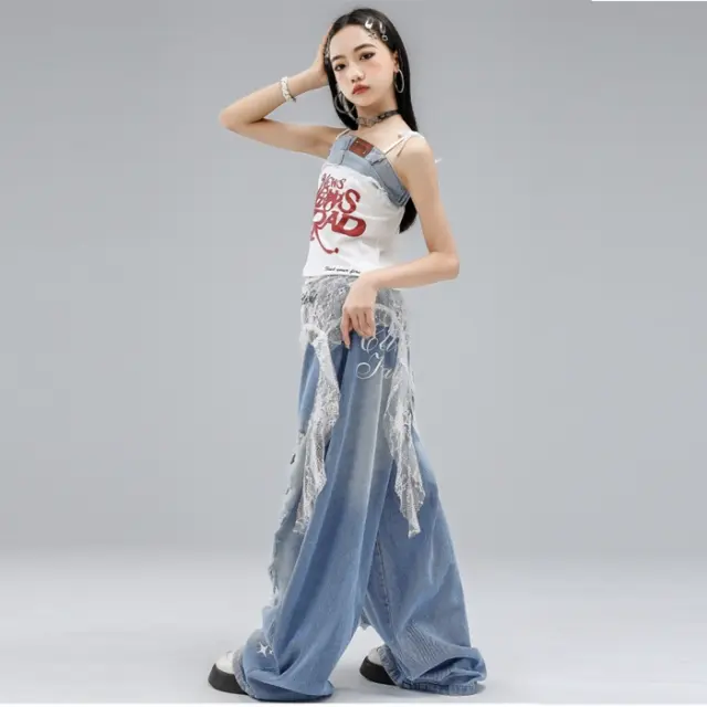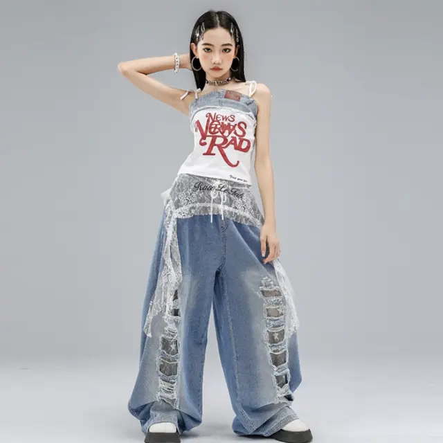 キッズ ダンス衣装 ガールズ ダメージ ジーンズ デニム タンクトップ シャツ パンツ ヒップホップ hiphop kpop 韓国 子供 キッズ ダンス衣装 女の子