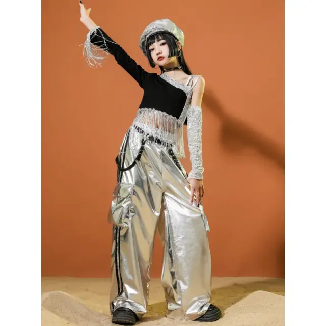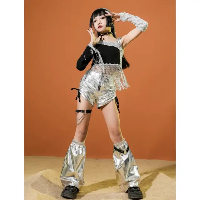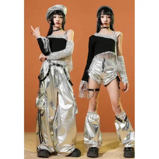 ステージで圧倒的な存在感を放つ、シルバー系のK-POPスタイルキッズダンス衣装。メタリックな質感がライトに反射し、まるで韓国アイドルのような華やかさを演出します。肩出し&ヘソ出しのデザインがトレンド感をプラスし、ダンサーらしい自信とスタイルを際立たせる一着。ボトムスはロングパンツとショートパンツの2タイプから選べるため、チームやシーンに合わせたコーディネートが可能です。発表会やコンテストなどのステージではもちろん、撮影やイベント衣装としても映えるデザイン。動きやすさとデザイン性を両立し、踊るたびに光をまとって輝くK-POP系の本格派セットアップです。