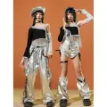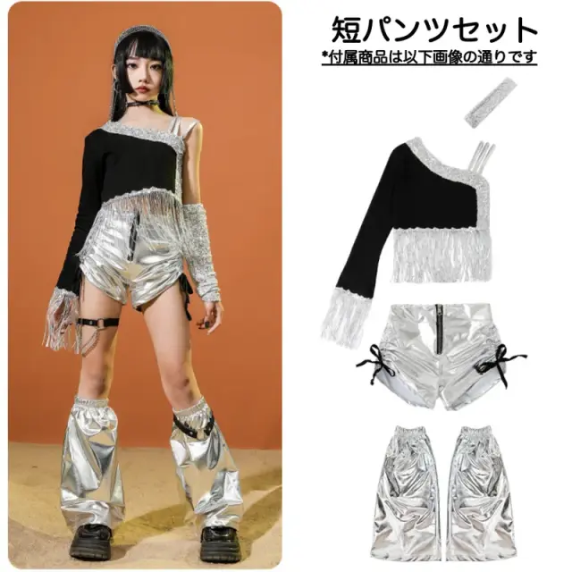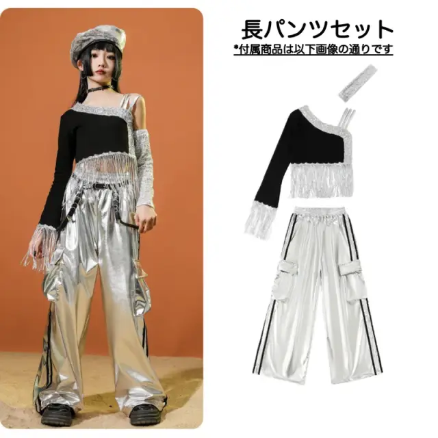 キッズダンス衣装 セットアップ 長袖 肩出し シャツ シルバー 銀色 肩出し ヘソ出し ショート丈 韓国アイドル ヒップホップ hiphop kpop 韓国 子供 キッズ ダンス衣装 女の子 男の子