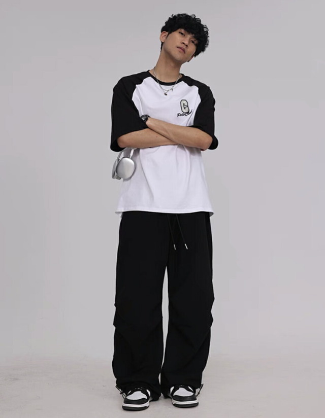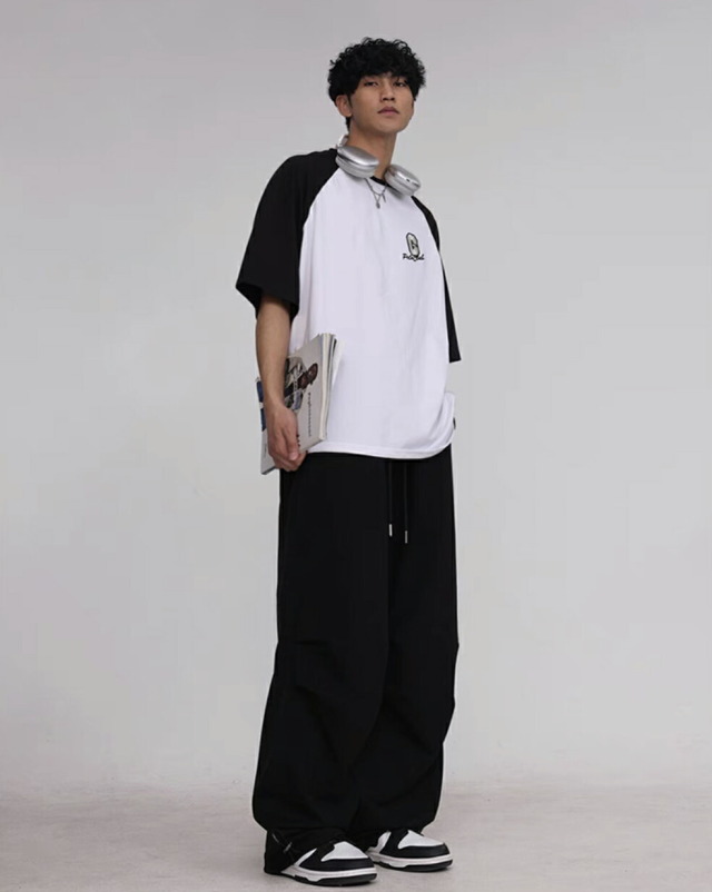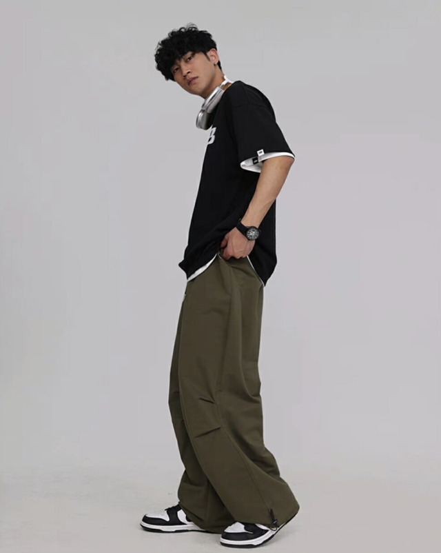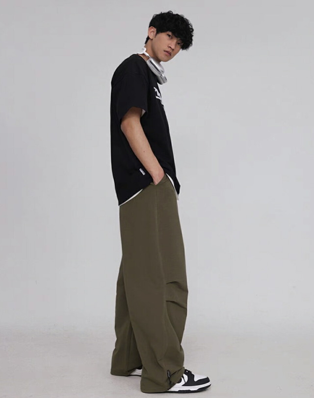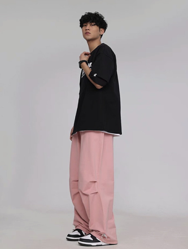 【CBX LAB】のメンズパラシュート・スウェットパンツです。ピンク、ブラック(黒)、カーキグリーン(緑)の3色展開。サイズはM・L・XL。オーバーサイズのワイドシルエットが特徴的で、ヒップホップダンスの練習着やレッスン着、部屋着として最適。韓国kpopストリートファッションにもマッチするメンズ向けパンツです。