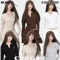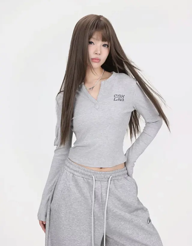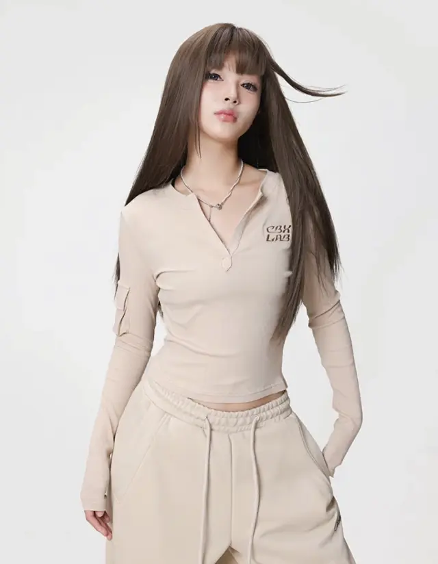【CBX LAB】のヘソ出しショート丈長袖シャツです。ブラック(黒)、ホワイト(白)、グレー(灰色)、ブラウン(茶色)、クリームの5色展開。クロップド丈デザインが特徴的で、ヒップホップダンスの練習着やレッスン着として最適。身長168cmでLサイズ着用。レディース・ガールズ向けのダンストップスです。