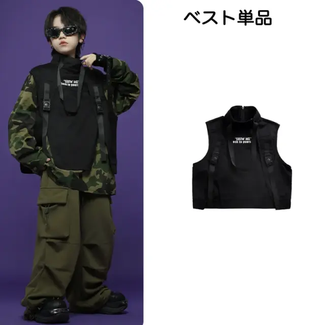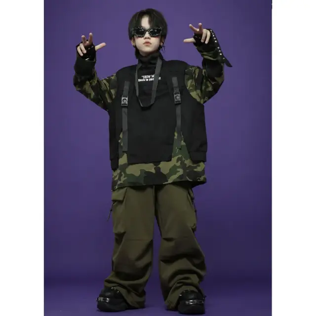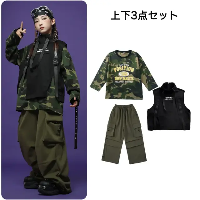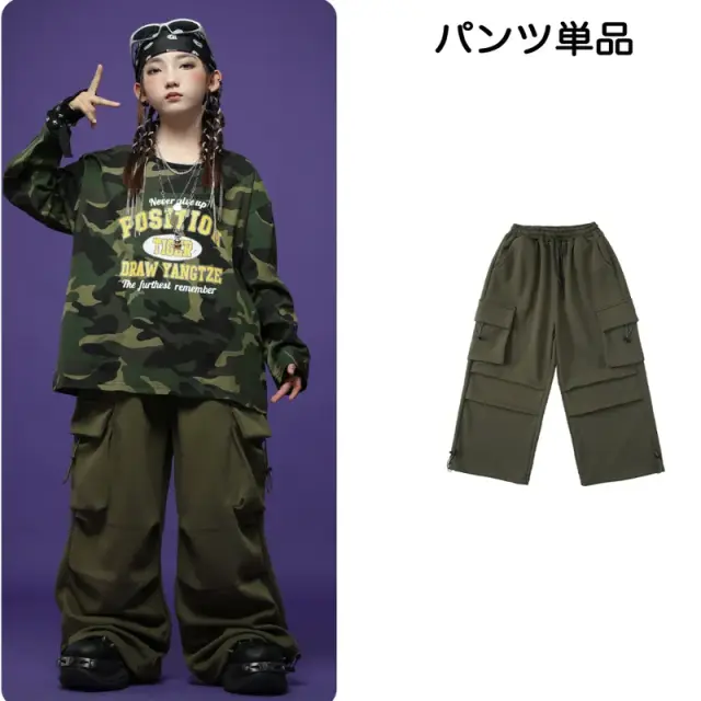 キッズダンス衣装 セットアップ 長袖 シャツ カーキグリーンカーゴパンツ ホワイト ヒップホップ hiphop kpop 韓国 子供 キッズ ダンス衣装 女の子 男の子