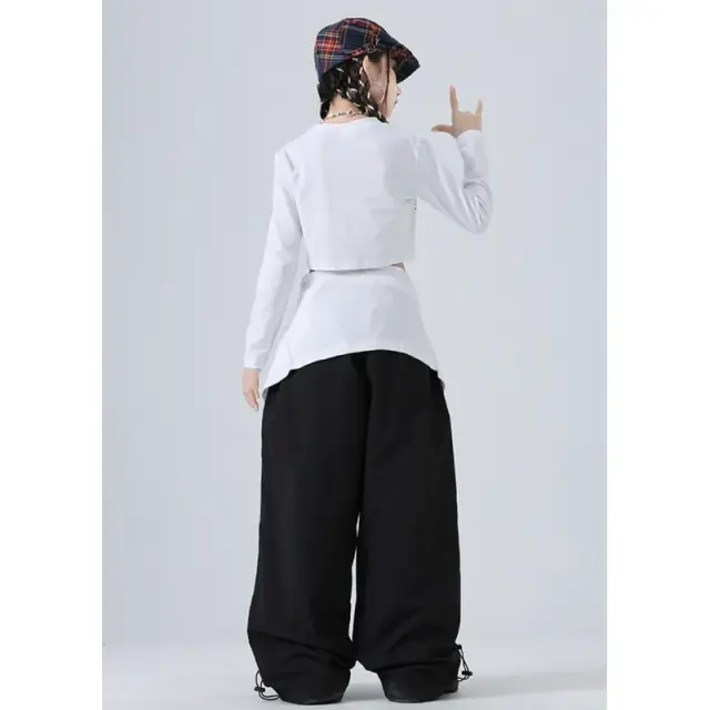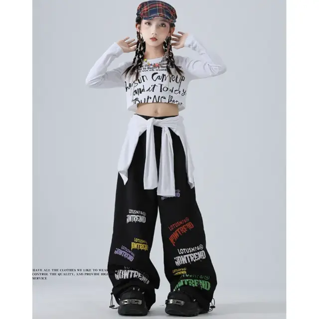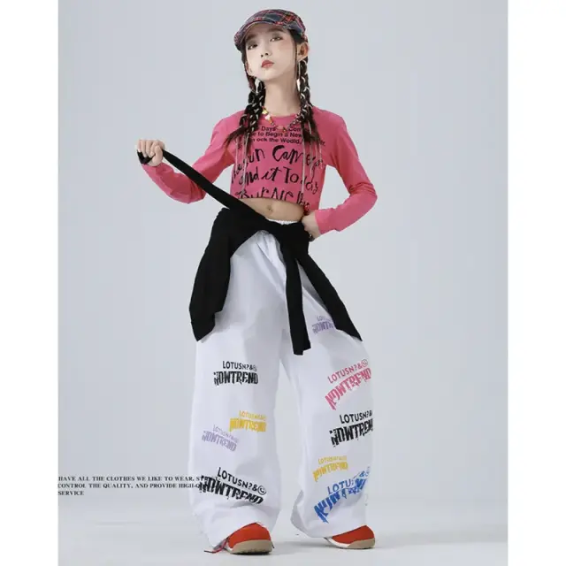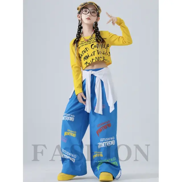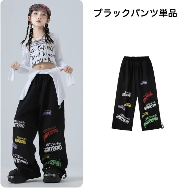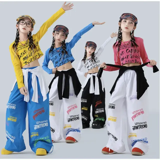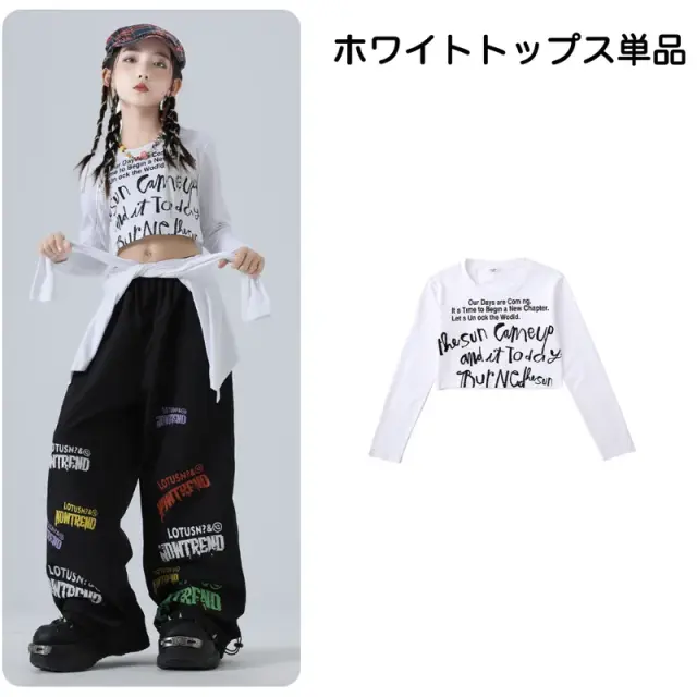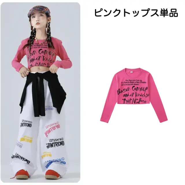 ステージで視線を集める、ポップなカラーが魅力のキッズダンス衣装。トップスは大胆な英字ロゴデザインの長袖Tシャツで、軽やかに腰巻きしたパーカー風アレンジがアクセント。パンツはゆったりとしたワイドシルエットのシャカシャカ素材を採用し、動くたびにリズムを刻むような軽快な揺れ感を演出します。ヒップホップやストリート系のパフォーマンスにぴったりで、発表会やコンテストではもちろん、練習着や普段着としても映える万能スタイル。カラフルで個性豊かなカラー展開も魅力で、チーム衣装としても統一感を出しやすいデザインです。ステージでも日常でも、自分らしいスタイルで輝ける本格派ダンスコーデです。