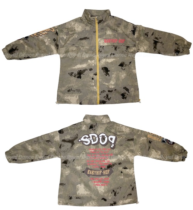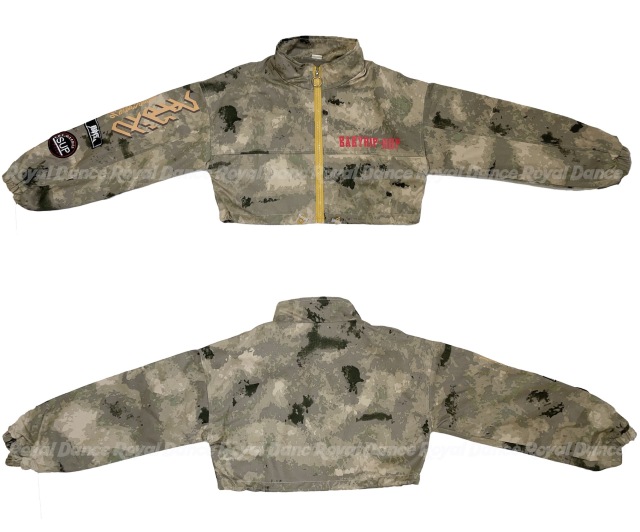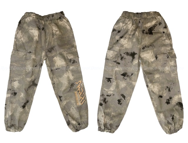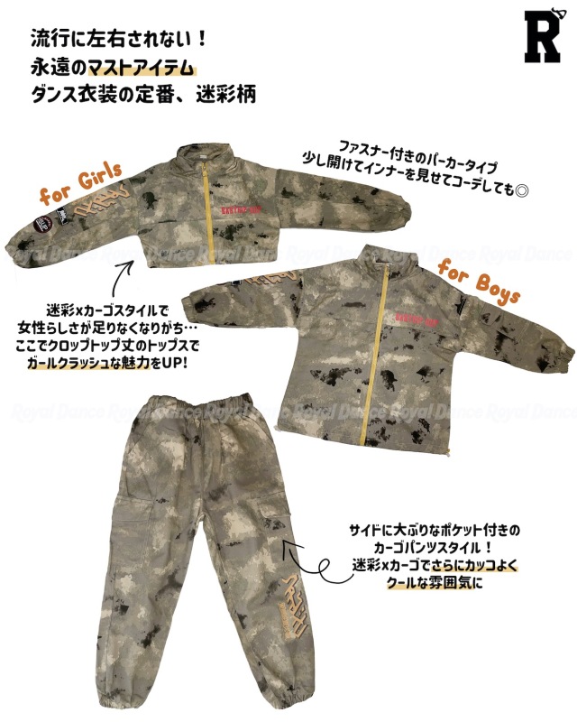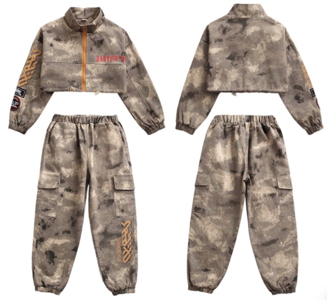 迷彩柄デザインのキッズダンス衣装セットアップ。カモフラージュ柄のトップスとパンツがセットになったヒップホップスタイル。ストリートダンス・K-POPダンスに最適で、韓国風のクールなデザインが特徴。8サイズ展開で男女兼用、お子様の個性を引き出すミリタリーテイスト。レッスンから発表会まで幅広いシーンで活躍し、キッズダンサーに人気の高いカモフラージュ柄セットアップです。